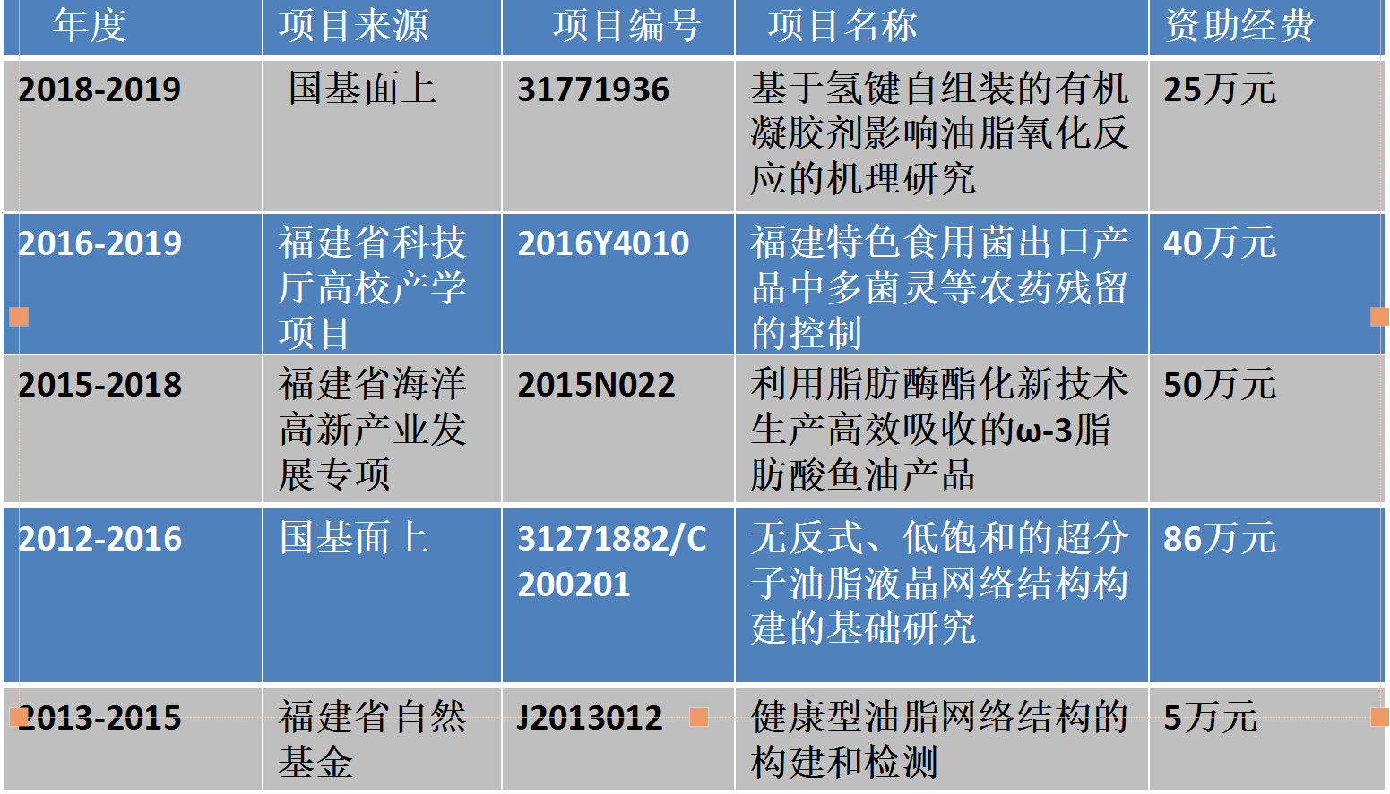 食用油脂和蛋白质科学与工程以及食品安全控制与检验领域,获得美国专利授权1项,4项中国专利授权;发表学术论文40余篇,被SCI收录12篇,其中以第一作者发表SCI收录论文4篇。主持国家自然基金面上项目2项、国家教育部留学基金、福建省自然基金、福建省科技厅重点基金、学项目等20余项。