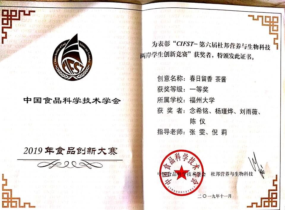 学生创意作品“春日留香 茶酱”获CIFST-第六届杜邦营养与生物科技两岸学生创意竞赛一等奖