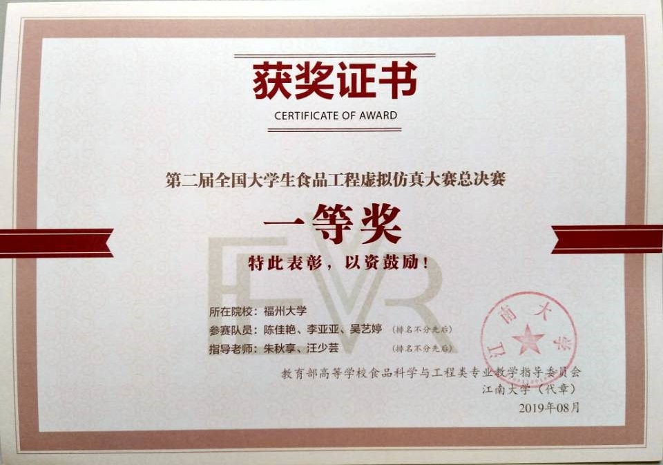 学生荣获第二届大学生食品工程虚拟仿真大赛总决赛一等奖