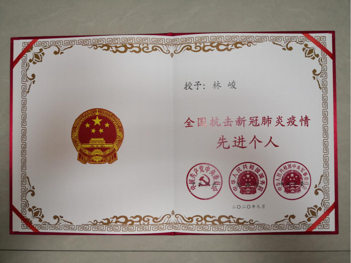 林峻博士获 “全国抗击新冠肺炎疫情先进个人”称号,并在人民大会堂接受表彰。