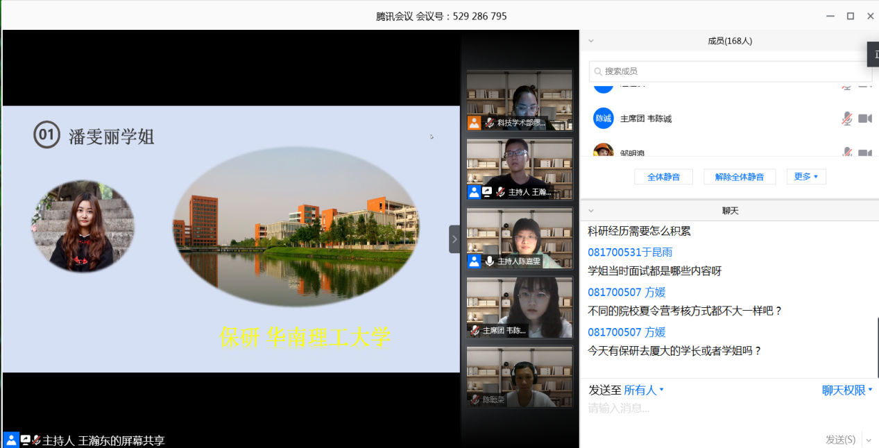 借由腾讯会议平台,举办了2020年考研经验分享会,此次网络分享会由院学生会科技学术部主办,陈佳雯和王瀚东同学主持,学院党委曹仁秋副书记、团委书记周越老师,辅导员林婧烨老师,以及七位考研成功的2016级学长学姐参加,会议在线人数达到近200人。
