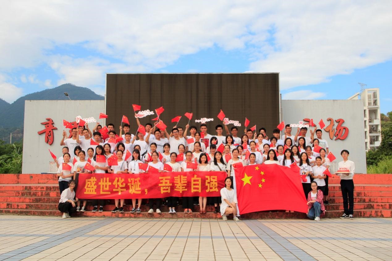 国庆当天早上,19级部分新生于图书馆前的阶梯上排列成“70”字样队形,为祖国深情献唱《今天是你的生日》,祝我们伟大的中国70年岁生日快乐。合唱结束,合唱的同学们在国旗下留下了难忘合影。
