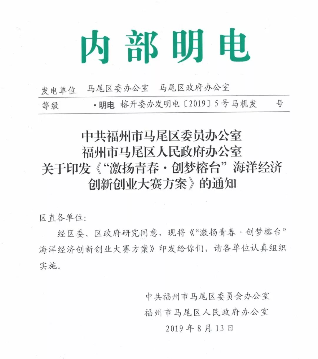 为深入贯彻习近平总书记关于支持青年人才创新创业的重要指示,吸引海峡两岸青年人才创新创业,落实《2018年福建海洋强省重大项目建设实施方案》及《“海上福州”马尾区行动方案》,促进我区冷链物流、远洋捕捞、水产品精深加工、海洋工程装备制造等海洋产业转型升级,推动我区海洋经济高质量发展,促进海洋经济产业回流,经协会发起,马尾区将举办‘激扬青春·创梦榕台’海洋经济创新创业大赛”