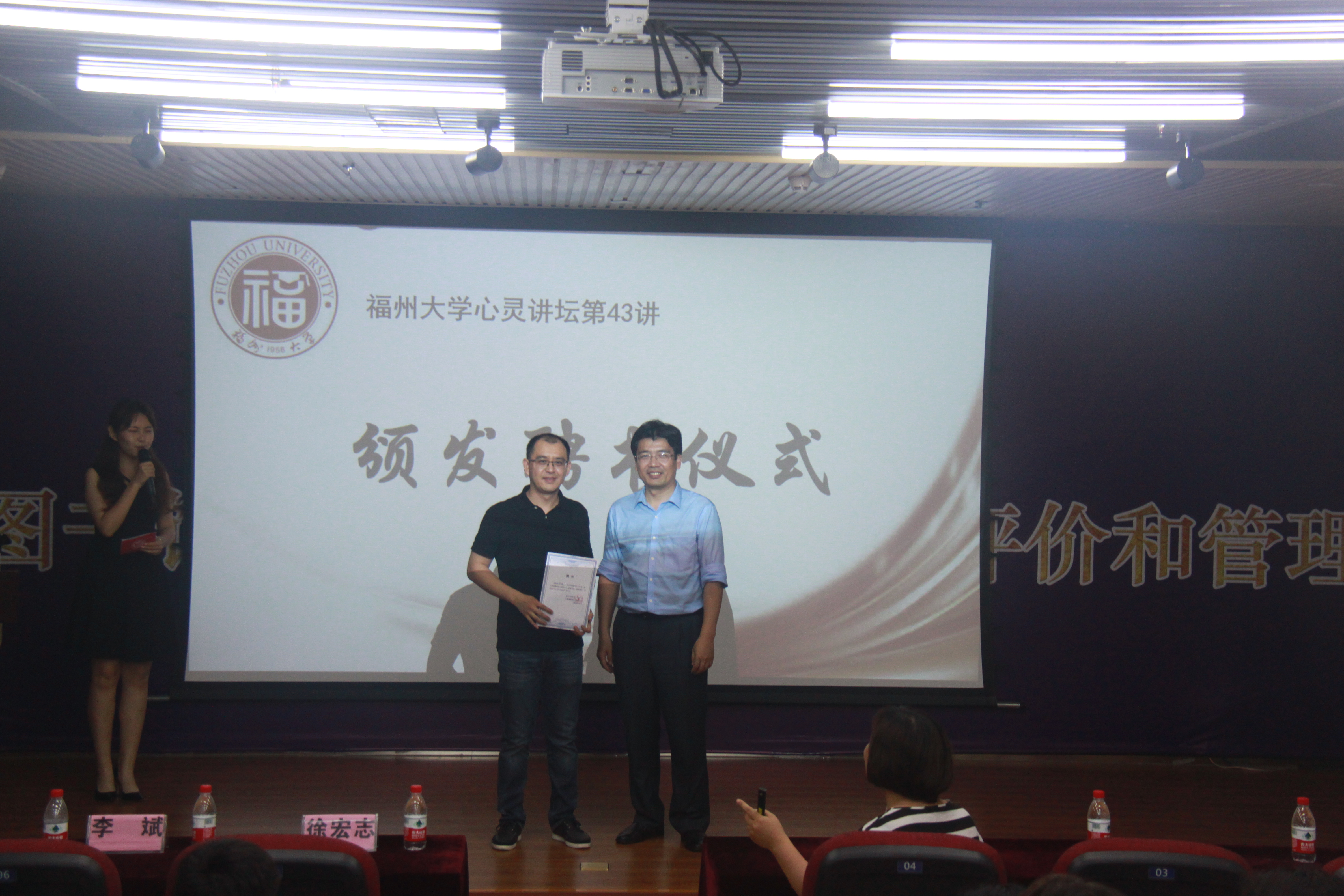 外聘教师,福建省心理卫生协会常务理事、秘书长李斌老师。出席讲座的还有学生工作部(处)徐宏志副处长,心理健康教育与辅导中心主任潘曦主任。