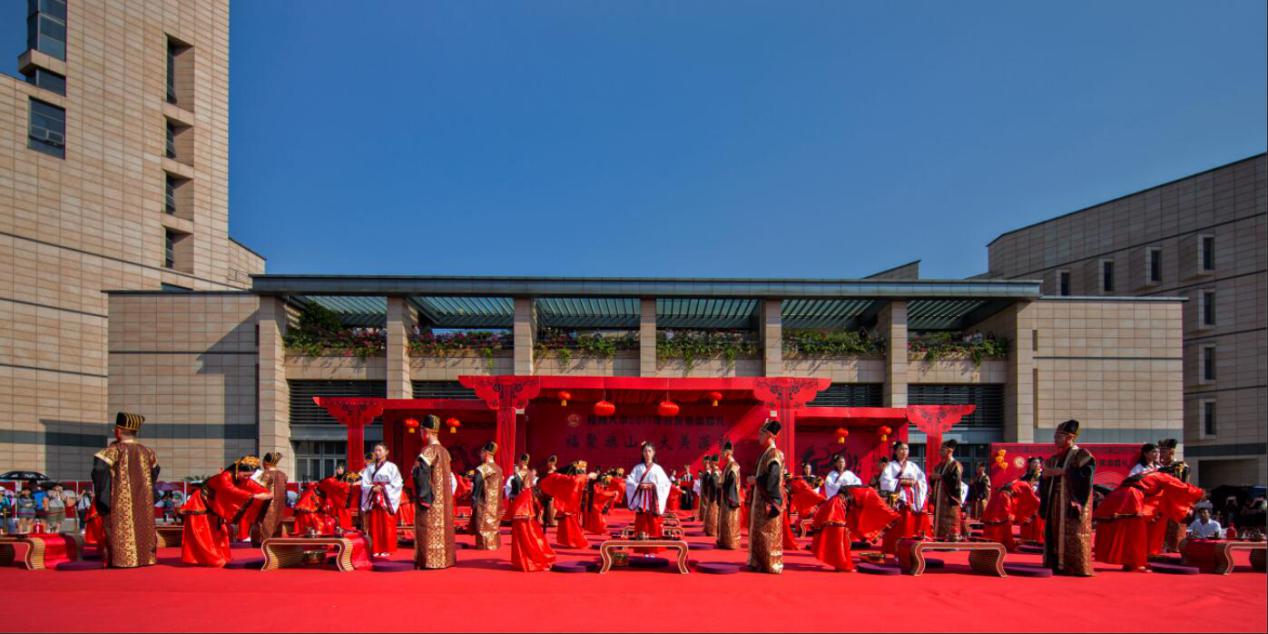 旗山校区图书馆福万广场顺利举行,二十二对新人在这一天内携各自的亲友、恩师与校党委林生副书记、全体志愿者们共同庆祝这一盛事。