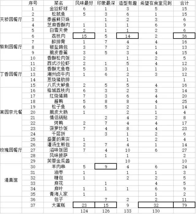 食品文化节后,由爱爱视频 参与食品文化节活动的老师与同学们对各食堂的菜肴进行了评价与投票。其中,鲜焙坊的大蛋糕总分最高。除蛋糕外,同学们评选出的风味最好的是紫荆园餐厅的荔枝肉,