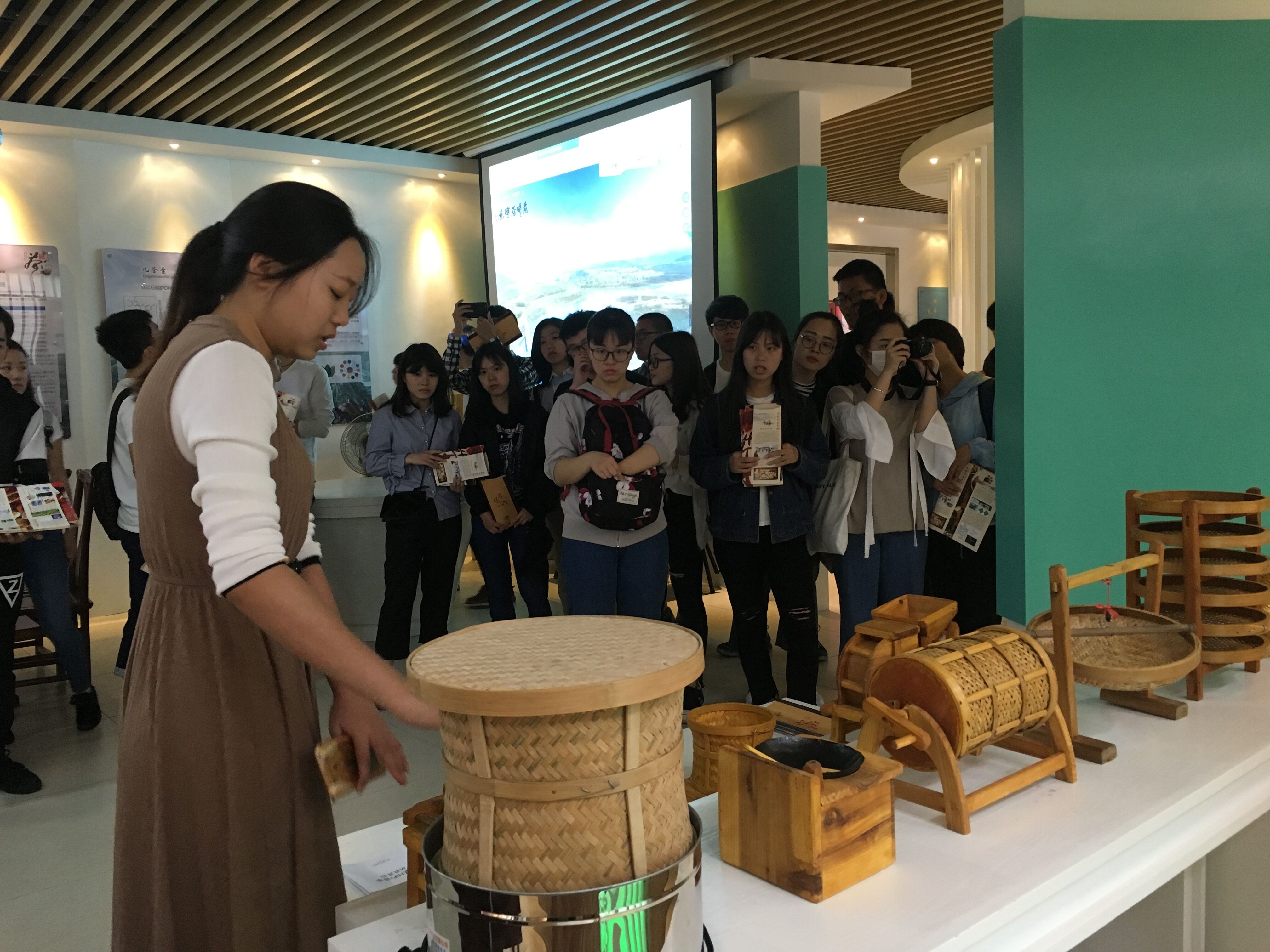 自主研发的创新茶产品,同时向来宾们介绍了晨曦茶博苑的来源和现在的发展情况。来宾们对茶博苑展出的制茶模具表现出浓厚兴趣。在介绍完藏品之后来宾们向郑丽婷老师提出一些日常生活中制茶饮茶的问题,得到了详尽的解答。来宾们对茶的创新有了更多的了解。