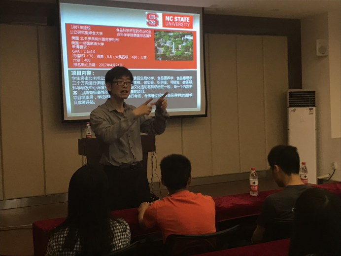 邀请在生工北楼柏物产厅进行有关申请美国北卡罗莱纳州立大学暑期交流项目的宣讲,到场的听众主要为大一、大二及大三的学生。
