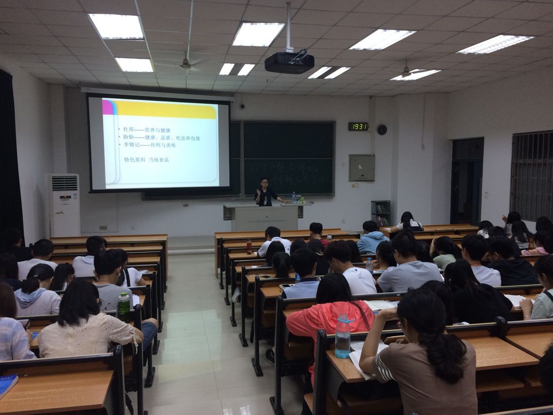 学生的得奖作品,比如燕丝,方便鱼糜面,笋心笋意等,充满了创意。同时老师也分析得奖作品的得奖原因,并鼓励大家从生活中寻找灵感。接着老师告诉同学们写策划书应该注意什么,包括后续操作的注意事项,并简单介绍了盼盼与李锦记两个创新大赛的比赛要求。宣讲会的最后,老师让同学们提出疑惑,并耐心进行解答。
