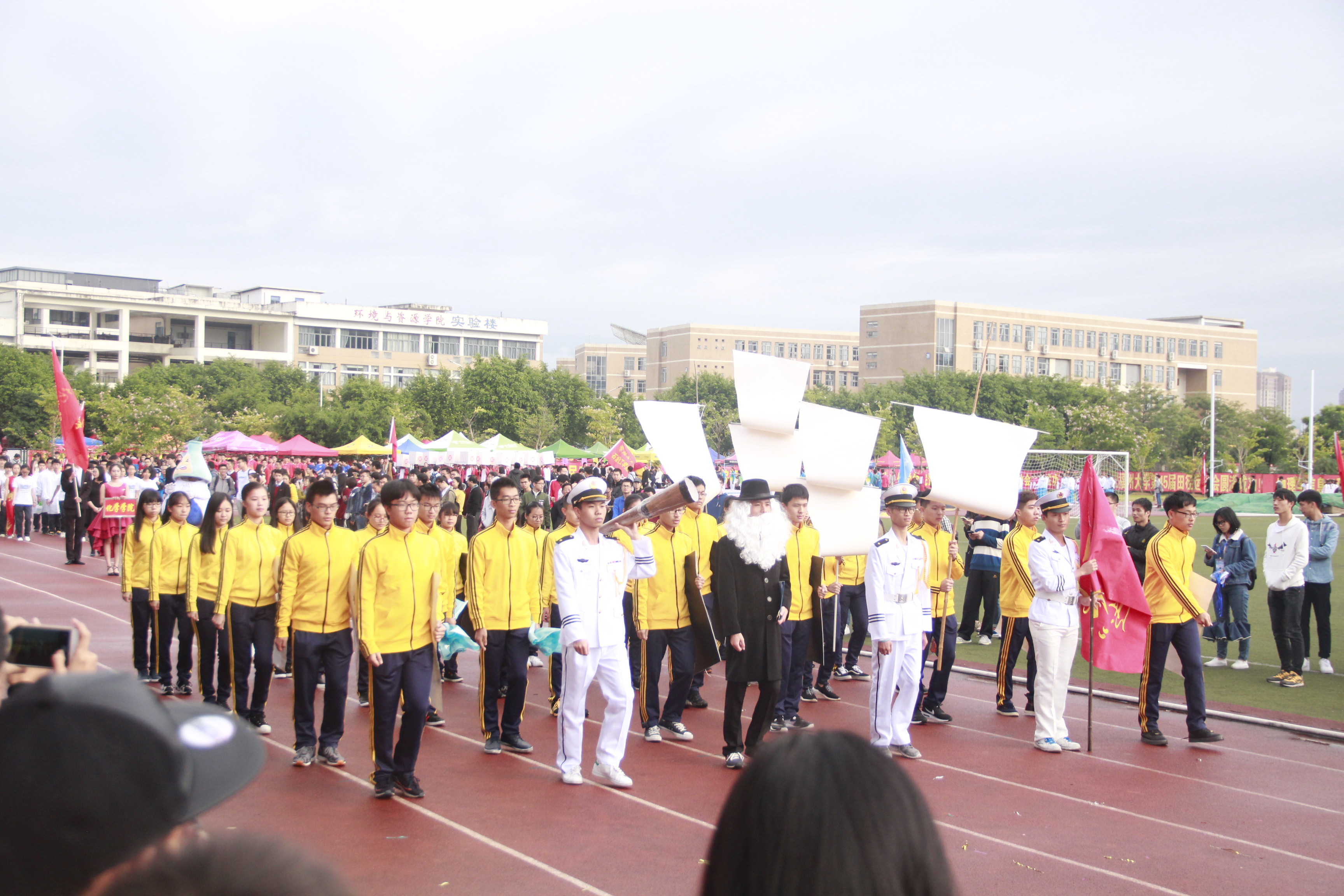 的同学们身着代表生机的亮黄色运动装,迈着从容自信的步伐走向主席台。行进的队伍在主席台前停下,一艘巨大的“贝格尔号”在跑道中央在跑道中央展开,白帆渐渐扬起,“达尔文”领着他的三个船员走向船头,用望远镜观察航道,指引帆船前行。船身上十六位同学,手持十六张加拉帕戈斯群岛物种图以及达尔文最经典的人类起源图,用最简单的方式,最全面地诠释了生物的起源。
