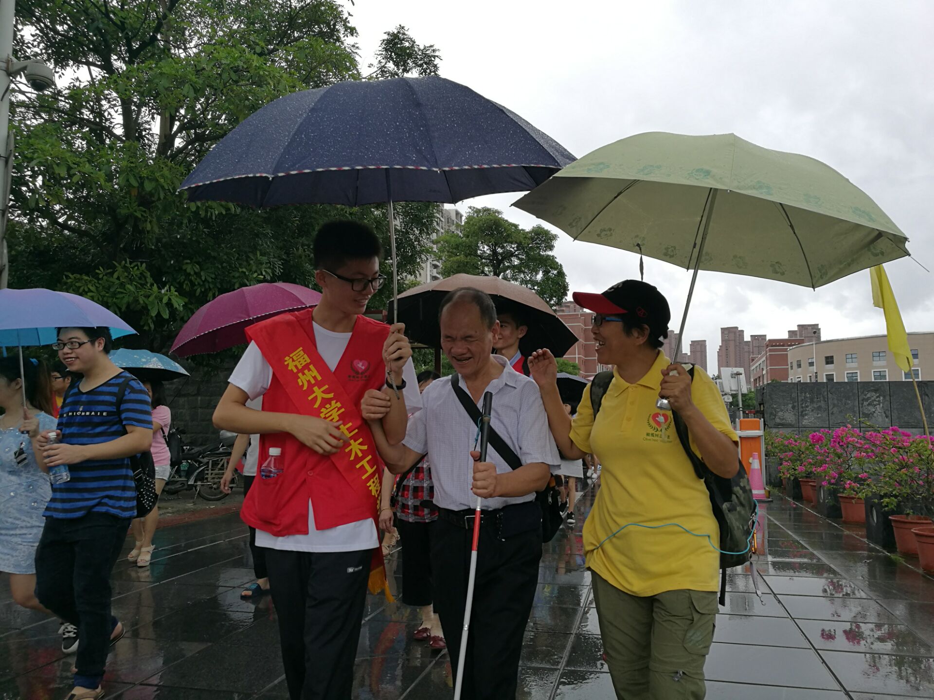 活动当日,志愿者们早早地集合,将盲人朋友接到福大并与他们在福大门口合影留念。志愿者们与盲人朋友共同游览福大校园,虽然天空淅淅沥沥地下着小雨,但他们挽着盲人朋友的画面,让雨中的福大,顿生温情。志愿者们和盲人朋友手拉着手,从福大东门进入,途经生工大楼、土木大楼、校友阁以及校图书馆。盲人朋友们表示:志愿者们充满热情,同时也很细心,很有耐心,很喜欢和这样一群年轻人待在一起。