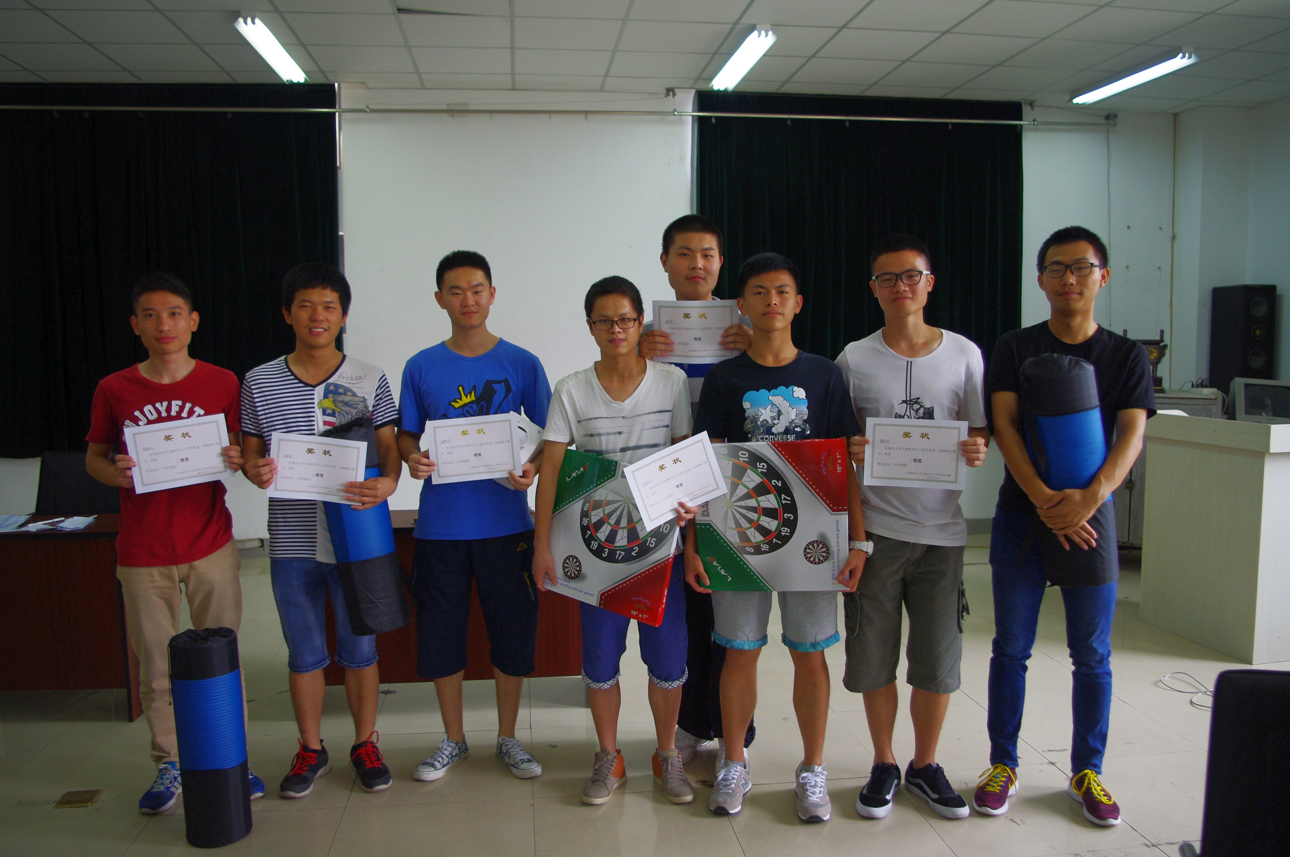 生活部承办,参赛者以宿舍为单位展开角逐。比赛共分为三大类,分别是象棋,五子棋和斗地主。比赛前,参赛者先进行热身。正式开始,参赛者抽签决定比赛对象,三类比赛同时进行,采用晋级制度,逐步淘汰。最后得分将小组组员的全部积分相加进行排名。比赛中,同学们都展示了不俗的牌技和棋艺,以棋会友,乐在棋中。经过激烈的角逐,八号楼318宿舍摘得桂冠,八号楼218和302宿舍获得二等奖,八号楼216,301和323宿舍获得了三等奖。
