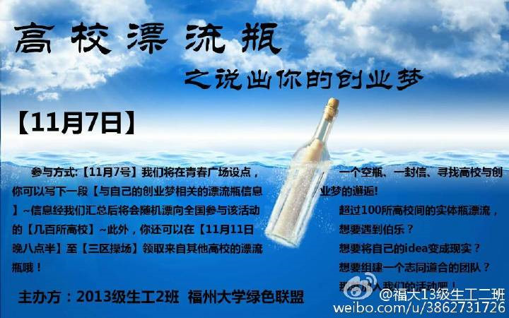 为更好贯彻落实李克强总理关于“大众创业,万众创新”的号召,向同学们传递创新理念以及最新的创业政策11月1日至11日,13级生工2班联合绿色联盟开展高校漂流瓶之说出你的创业梦活动,通过收集同学们的创业梦以漂流瓶的形式向全国各大高校的大学生传递创新理念以及创业政策,为创新创业事业添砖加瓦。
