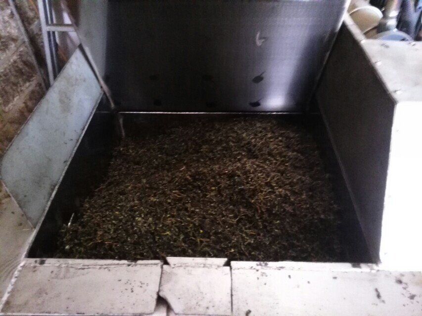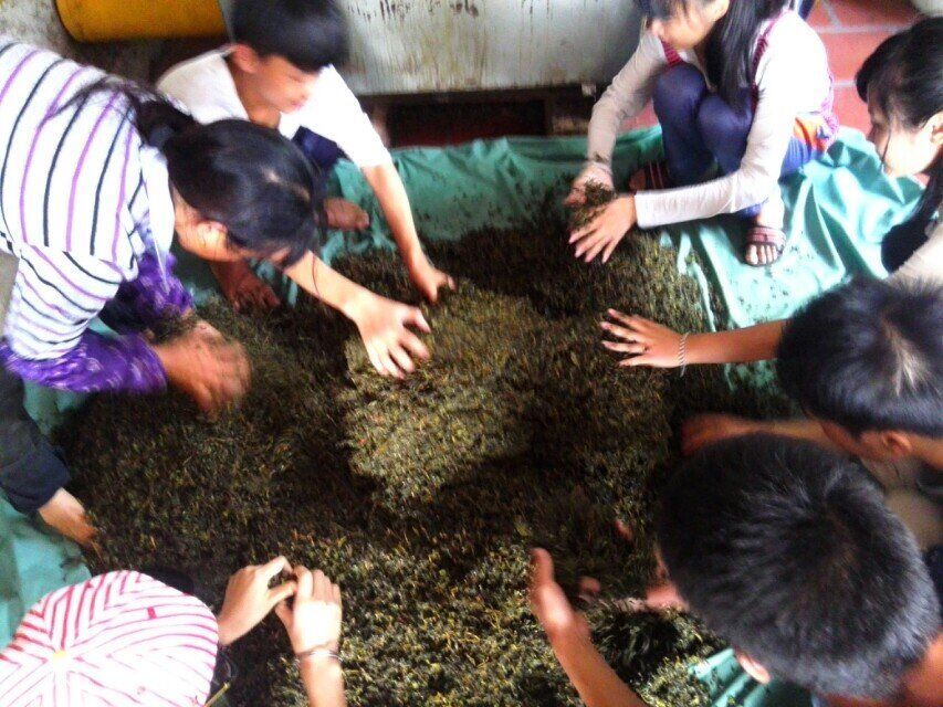 第三天我们又来到茶农家,向茶农了解其他加工步骤的具体操作。经过一个晚上的发酵,接下去就是杀青,杀青是制茶最关键的一步。经过杀青把发酵后的生茶叶加工成为熟茶叶。杀青时需要特别注意火候的控制,火太大做出来的茶叶会有火味,有可能盖过茶味,火太小茶叶则会因在冷火下太久,叶片会变成红色,之后做出来的茶叶要么茶末很多要么色泽很差。杀青后便进行揉捻。揉捻最初全部是用人工做出来的,耗费人力,而且劳动效率很低。茶农告诉我们,随着时代的进步,机械逐渐代替了手工。液压速成机代替了人力劳动,大大减少了人力物力。经过揉捻后的茶叶形成一块十分紧密茶饼。再将茶并重新打散。之后经过反复几次的揉捻和打散,扁平的茶叶逐渐卷曲变成圆球状。这时的茶叶已经形成我们在市场上看到的形状。但是还有最后一步,茶叶还要在烘干机中进行烘干。茶叶的制作过程需要经过这样反复的几次加工,最终才会成为市场上销售的茶叶。