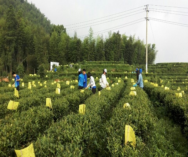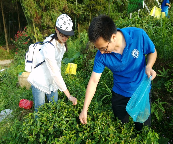 当实践队队员刚来方家山村的时候,热情的师傅就泡了自制的红茶让队员们品尝。方家山村红茶内质清芳,色泽乌润,应证了“非叶非花自是香”这一古诗词,7月15日实践队也终于有了体验采茶乐趣的机会。清晨六点,实践队队员便手提着茶篓随陈老师来到了茶园。方家山村的茶园就着阳光雨露,生长良好。整个栽培的过程中采用色板诱杀的物理防治方法,将专用胶剂制成蓝、黄胶粘害虫诱捕器,绿色无公害。采茶前,陈老师嘱咐说,采茶是有讲究的,要认真观察枝梢尖,采摘“一心两叶”,也就是要求采摘的茶叶托蒂部位刚好附带着两片新叶,采摘的过程中也要注意不要有疏漏。听了陈老师的话后,实践队队员纷纷动手忙活了起来。虽然清晨茶园的杂草上露珠偏多会沾湿裤脚,但队员们丝毫不介意,手脚麻利地采摘了起来,茶园里到处都是队员们的欢声笑语。上午九点钟茶叶采摘结束,队员们的辛勤成果也受到了方家山村罗维铨书记的表扬。他表示队员们在采摘的过程中观察仔细,细心挑选,采摘的茶叶的质量很好。最后,实践队将少量茶叶与茶园的土壤用样品袋收集好准备带回学校对各项指标进行分析检测,以便后期对方家山村茶园茶叶的宣传及栽培方案的优化。