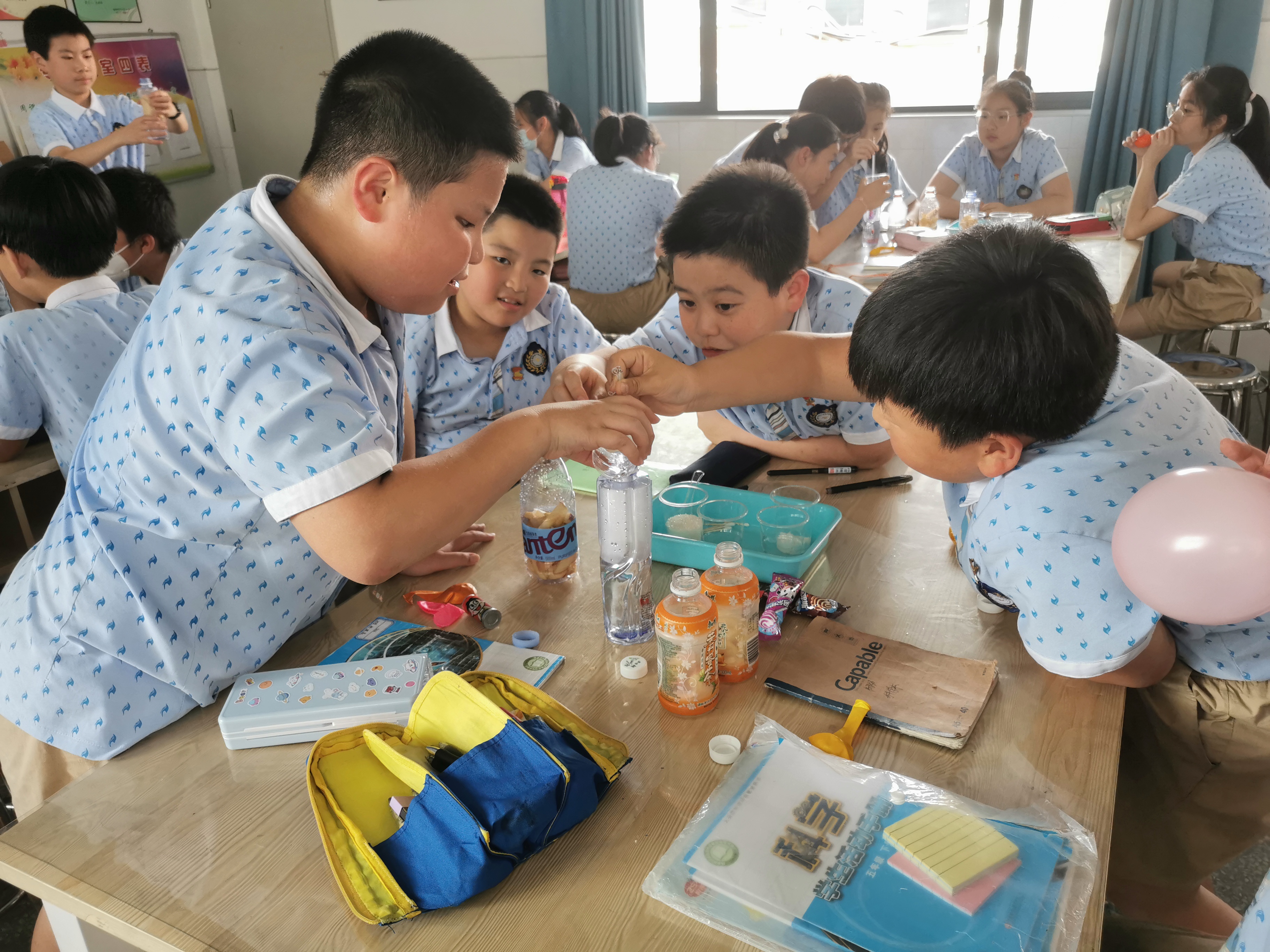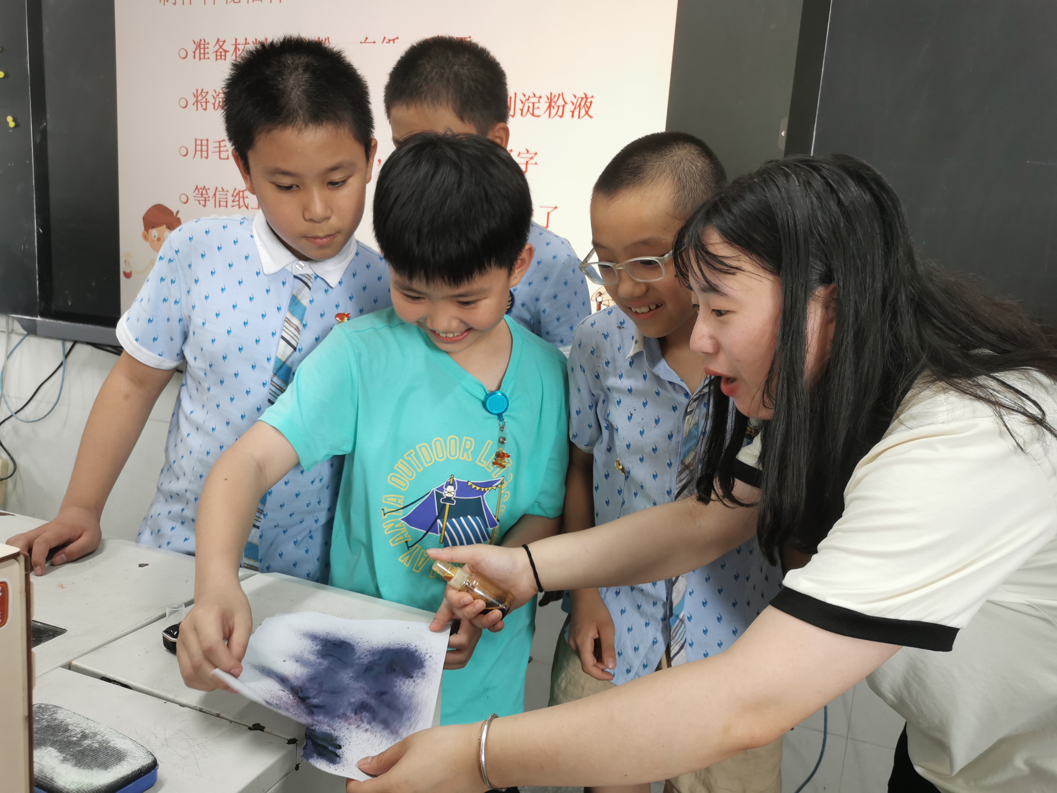 在最后,志愿者们带领同学们进行了“苹果酵母发酵的手套实验”、“淀粉遇碘变蓝和神秘信件”的趣味小实验,同学们兴致勃勃,积极投入到实验中来,做到知行合一。