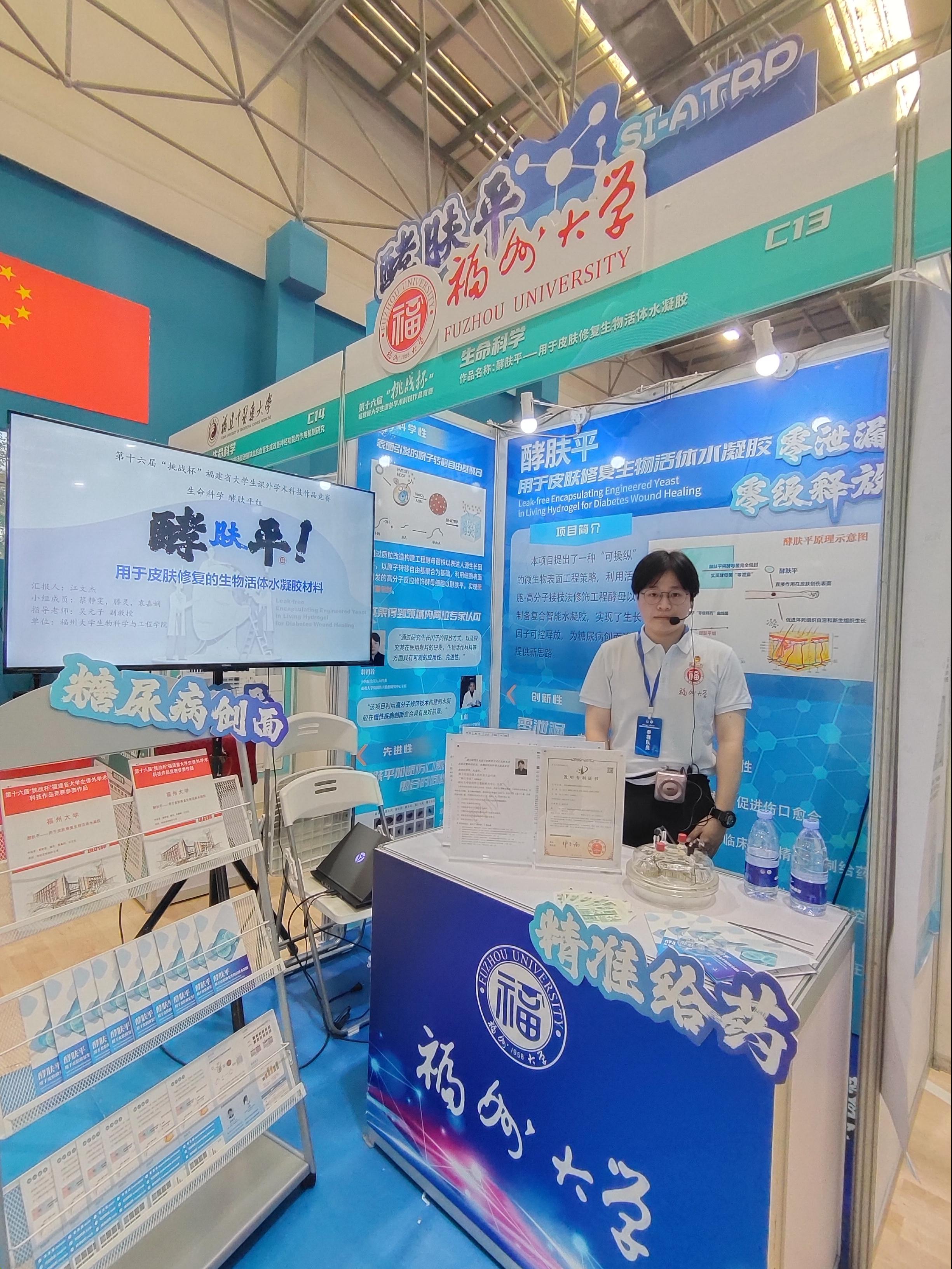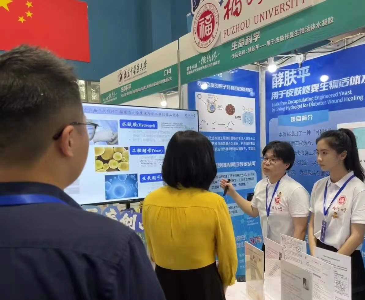 吴元子老师的指导,由蔡静雯、滕灵、袁嘉娴、江文杰四名同学合作完成。该项目为针对现有伤口敷料存在的缺点与不足,提供一种无泄漏封包酵母水凝胶及其制备方法,提出一种“可操纵”的微生物表面工程策略,构建工程酵母菌株以表达人源生长因子,在原子转移自由基聚合为基础前提下,利用细胞表面引发的高分子反应修饰酵母细胞以制备复合智能水凝胶,实现对酵母细胞的紧密封包和生长因子在微生物水凝胶体系中持续、稳定的表达与释放。实现生长因子可控释放的活体微生物水凝胶敷料,旨在为糖尿病创面治疗提供新思路。