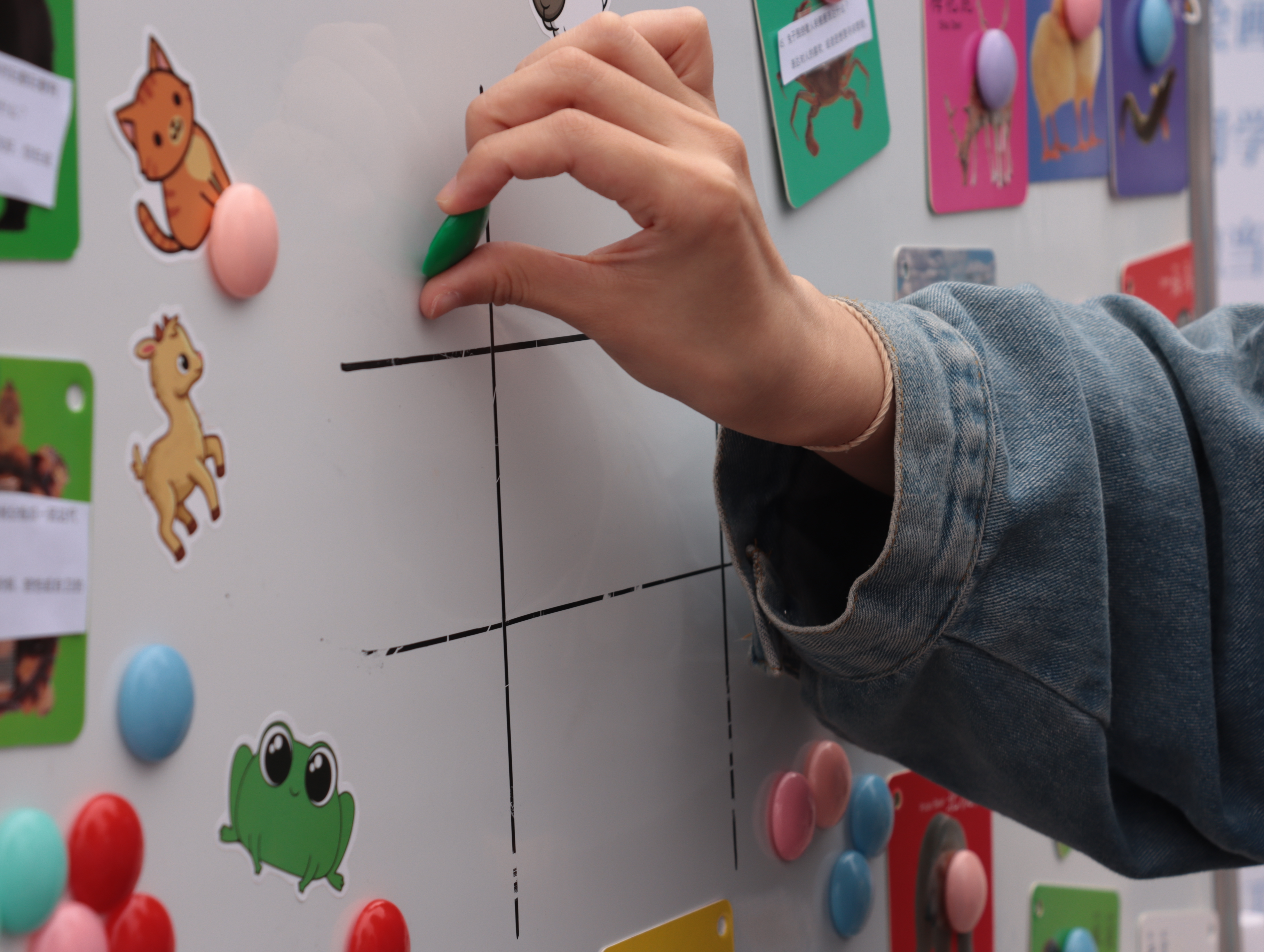 而在游戏区,参与者自行组队,再与其他队伍对抗答题,获胜方在白板上布置一颗棋子,率先三子连成一线的队伍就获得胜利,可以领取奖品。
