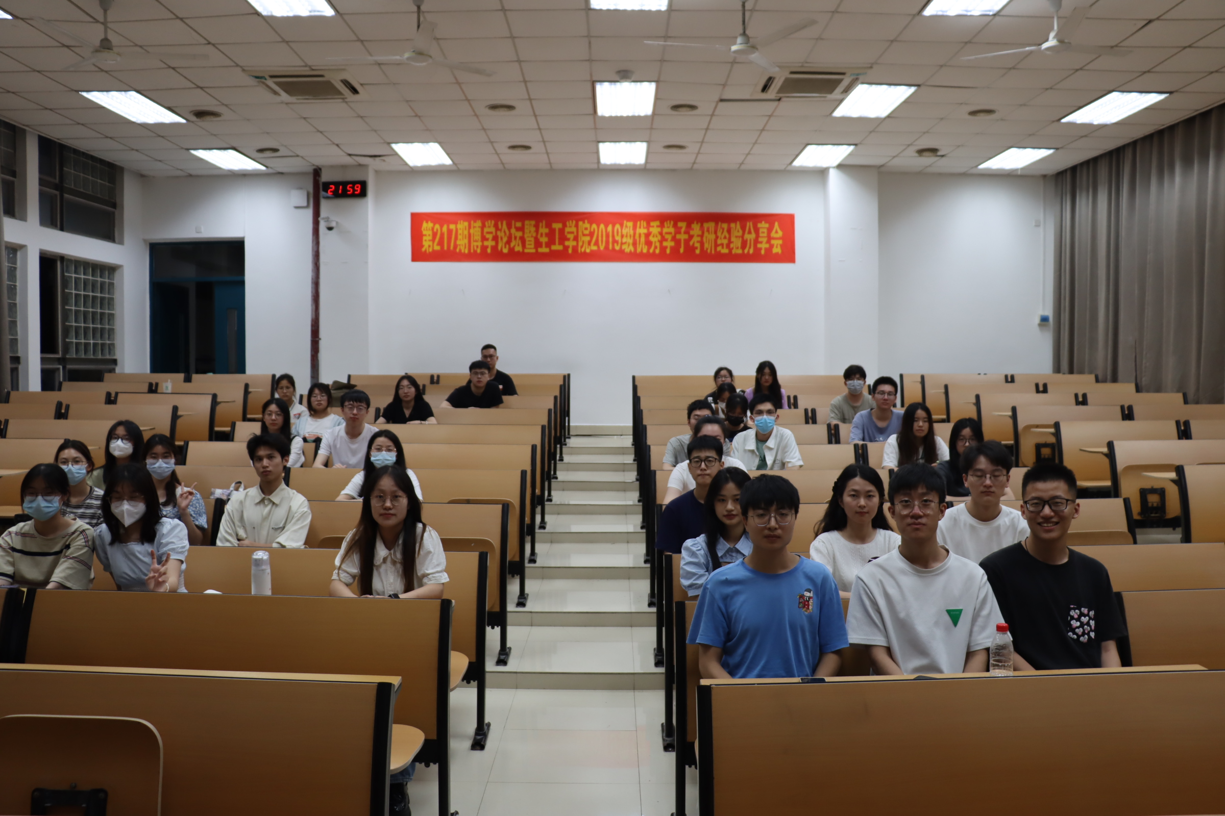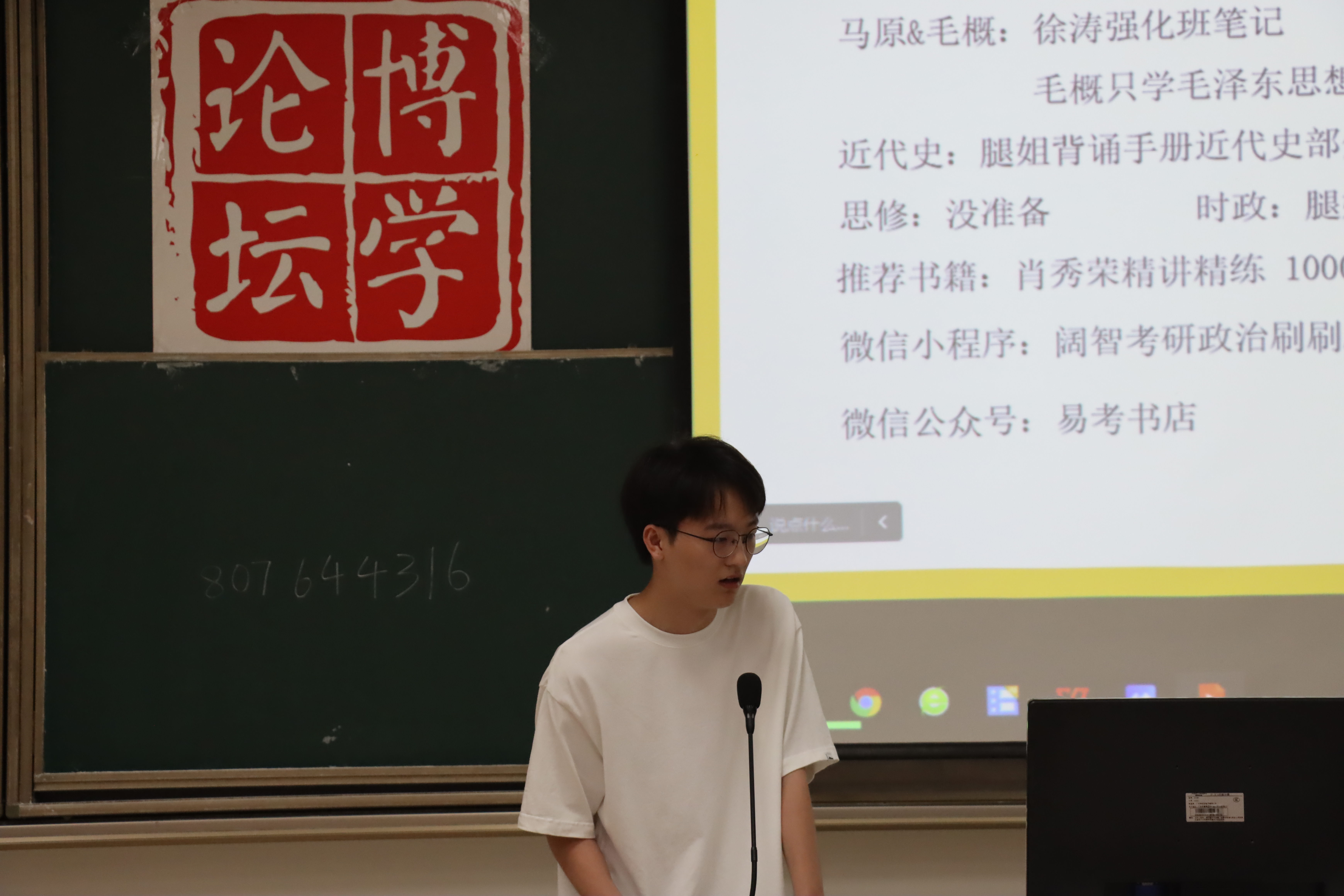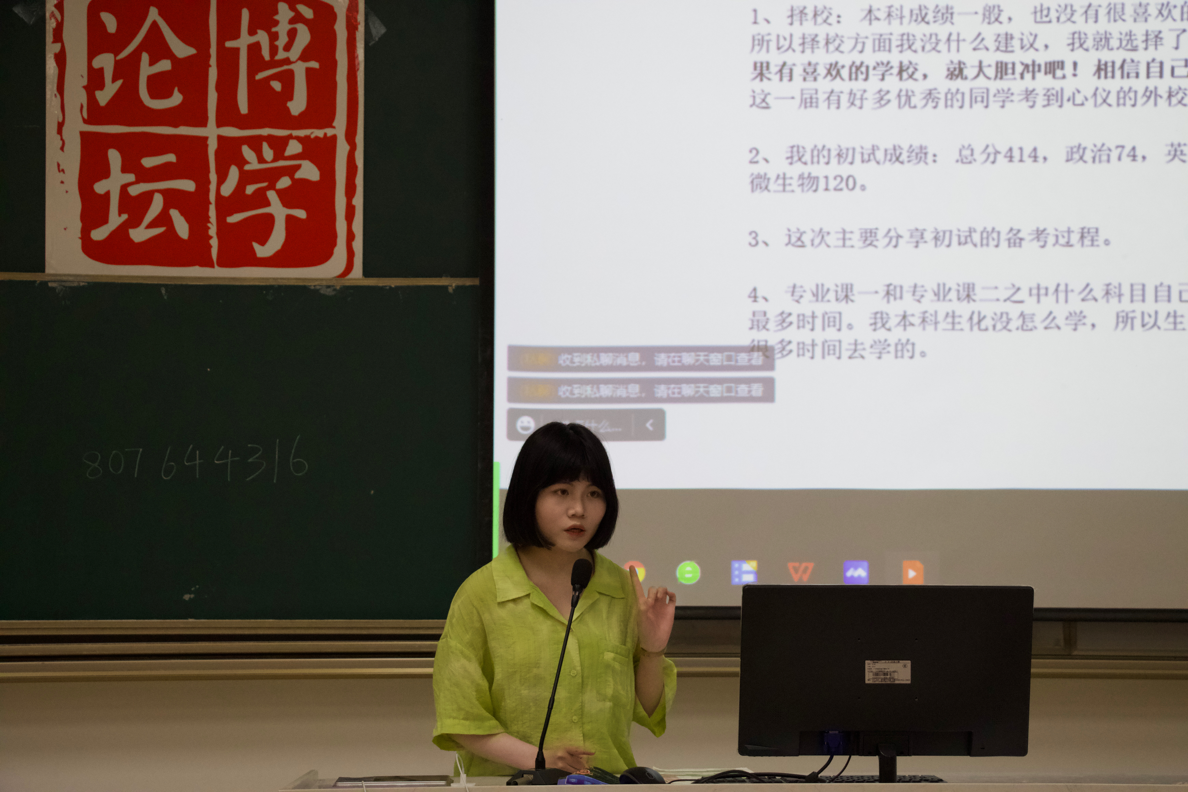 以线下线上同步进行的形式组织部分2019级考研成功学子分享考研心得和经验。本次分享会邀请了2019级练泓辉、王楠、王诚欣、张国龙等8位考研成功的同学分享备考经验,解答同学们困难疑惑。