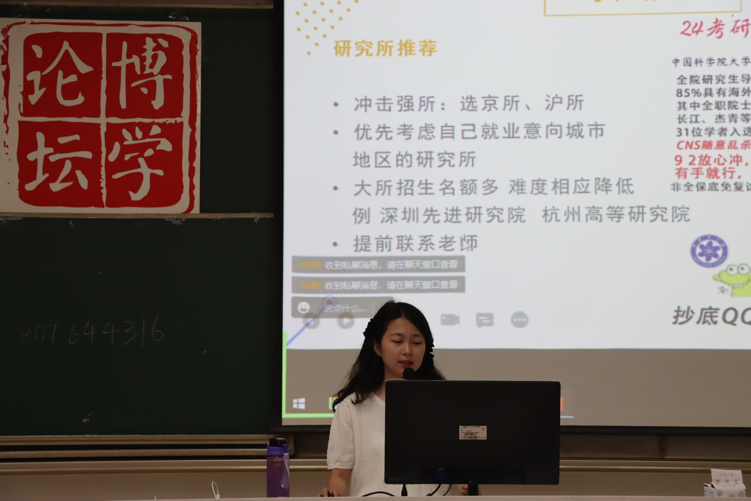 郑昕怡学姐用极大的热情为同学们分享了自己考研的各个方面心得以及人生道路上的感悟。学姐首先为大家科普了中国科学院大学的情况,为大家分清楚中科院与中科大的区别,安利了一波学校也拓宽了同学们的视野;学姐还就招生名额和地区优势推荐了研究所供更多的备考学子选择。“因为我的优势是查找信息的能力,所以我非常希望大家知道不一定只有考研这一条路”大家考研前一定要想清楚自己想做什么,不要随大流。分享的最后,学姐给予了真挚的祝贺——机会都是自己争取的,希望大家都能多方面开花,找工作、出国留学都是一个非常不错的选择。