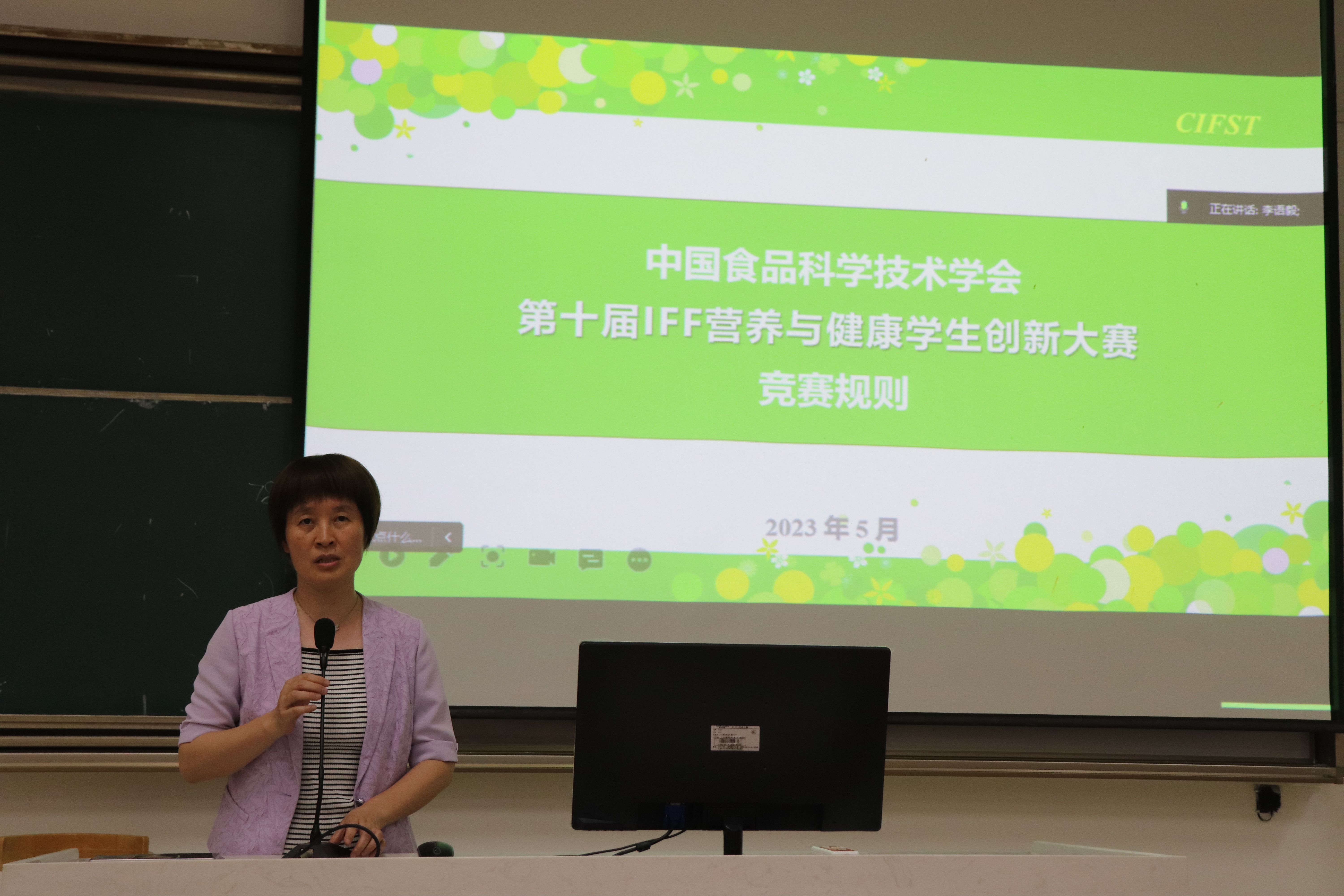 在IFF营养与健康学生创新大赛宣讲会上,学院食品创新比赛负责人张雯老师作为主持人对大赛主办方的到来表示热烈欢迎;院团委书记张晶老师上台发言以鼓励大家积极参加本次比赛,希望大家可以把平常所学的知识灵活运用到比赛中,收获难得的宝贵经验。