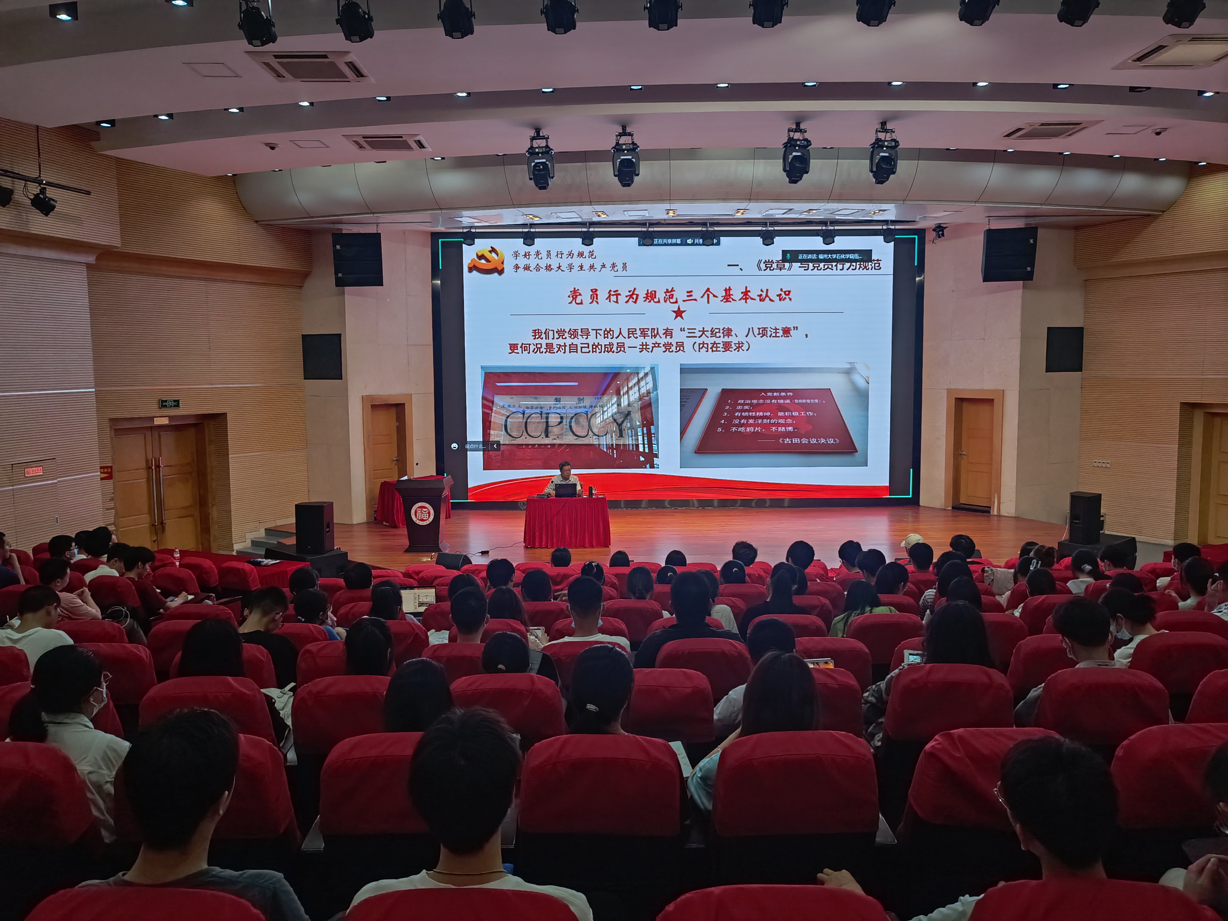 施卫华书记以《学习新党章 争做新时代合格大学生党员》为题,主要围绕“《中国共产党章程》与党员行为规范”、“尊崇《党章》遵守党员行为规范”和“如何成长为新时代合格大学生党员”三个方面,带领同学们深入学习《中国共产党章程》。施卫华书记结合党史视频带领同学追溯党辉煌灿烂的历史,为同学们解读历届党的代表大会对党章修改的深刻内涵与意义。他表示党章是党的总纲领、总章程,并从党章的重要性入手,引导大家学习了党的二十大对党章的修订内容,并要求广大学员提高思想认识,逐字逐句认真学习党章,指导自身的学习、科研和工作。