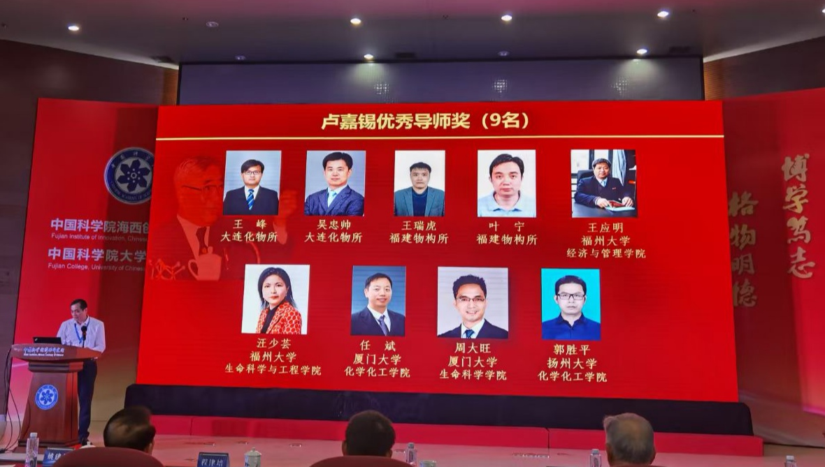 汪少芸教授荣获2020年度卢嘉锡优秀导师奖,颁奖仪式于2020年11月22日在中国科学院海西研究院隆重举行,汪少芸教授上台接受中国科学院院士颁奖嘉宾亲自颁奖。