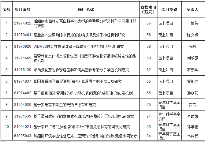 科技处消息,爱爱视频 2019年共获批11项国家自然科学基金,其中面上基金7项,项目负责人为:李婧影、陈文锋、徐丹、刘乐冕、石新国、翁祖铨、潘剑茹;青年基金4项,项目负责人为:罗芳、蔡茜茜、孙宇鹏(孟超医学与交叉科学中心)、韦族武(孟超医学与交叉科学中心)。获批科研经费(直接经费)合计507万元。在此,向获得资助的老师表示祝贺!
