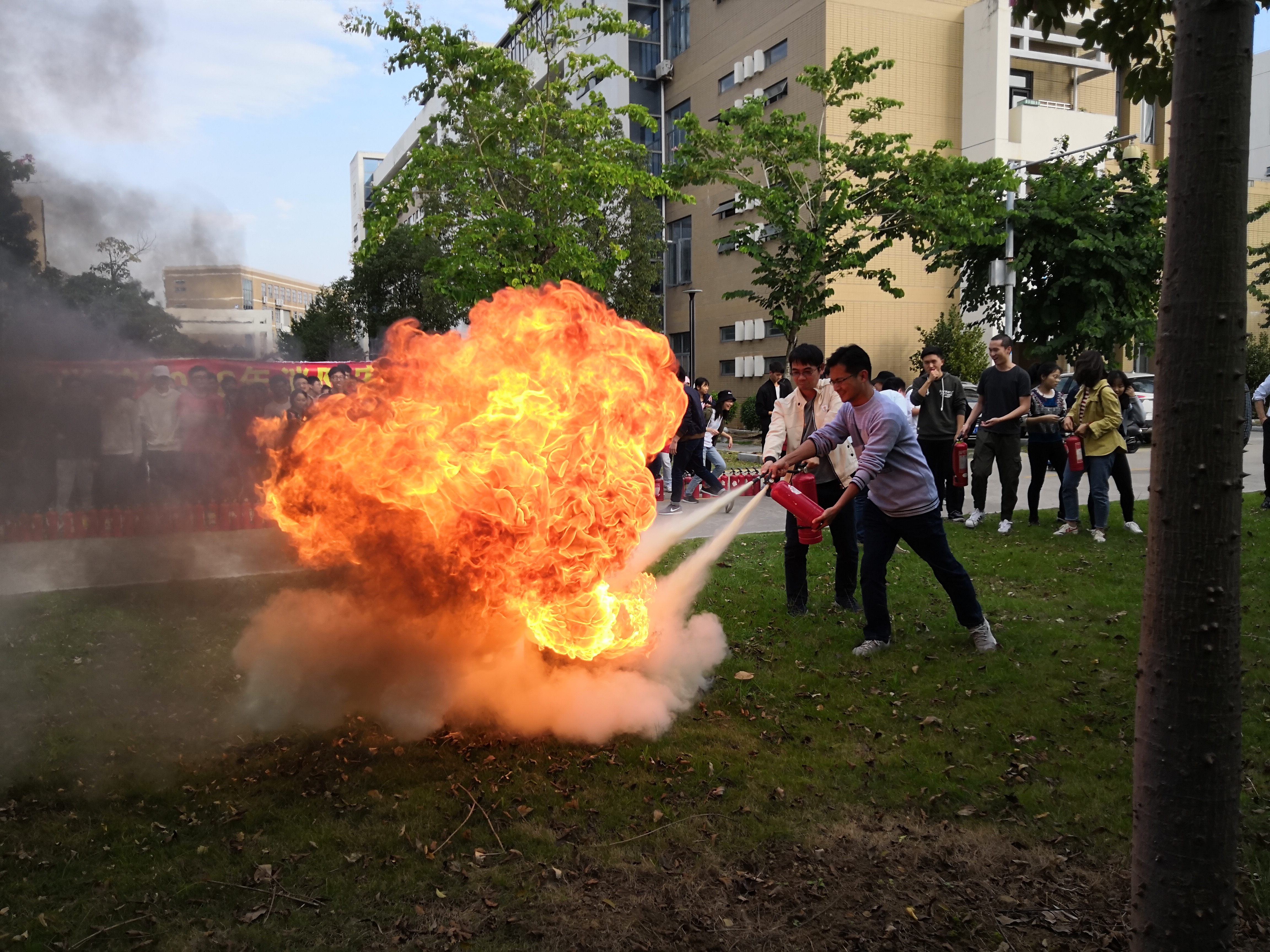 “纸上得来终觉浅,绝知此事要躬行。”在保卫部老师示讲解示范完灭火器正确使用方法及操作的注意事项后,同学们有序地拿起手中的灭火器严格按照步骤进行实践操作。随着灭火器喷剂的喷出,油盆里的熊熊烈火很快就被扑灭了。