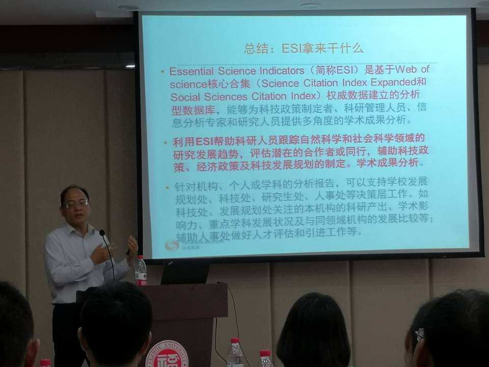 讲座过程中,詹老师帮助各位老师厘清了SCI、SCIE、SSCI、AHCI、ESCI等概念,指出了通过ESI能够揭示的几个重要指标:ESI学科、高被引论文、热点论文、研究前沿等。通过讲解、互动交流,为各位老师在个人和学科发展中提供了更为可靠的客观数据支撑,指明了努力的方向。