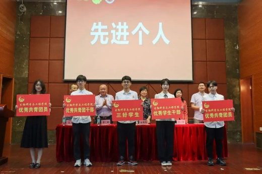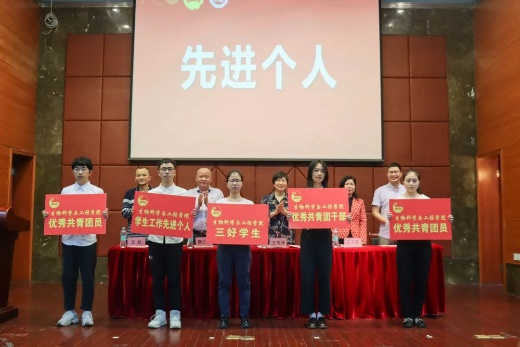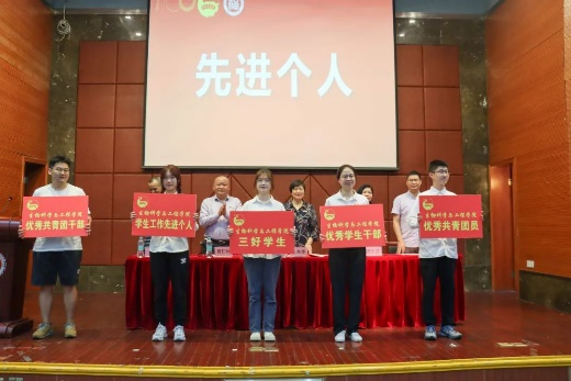 纪念表彰大会在庄严的国歌声中拉开帷幕。石贤爱副院长宣读了2021年度学校、学院“五四”表彰先进集体和先进个人名单,获奖师生代表依次上台领奖。