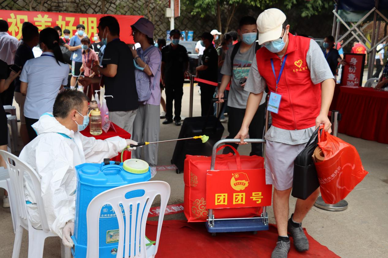 在疫情常态化防控的当下,学校在生活区入口安排了入校前必要的防疫措施——体温测量、行李消毒、更换口罩等都在防疫志愿者的监督下有序进行。