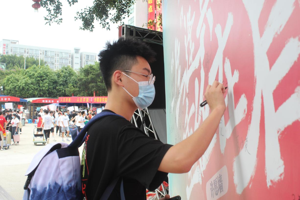 新生们在学生干部的引导下于报到处提交入学资料,填写入学信息。学院为新生提供装有新生手册、修读指南等物品的“新生大礼包”,方便他们更快地适应新环境。之后,新生在学生干部精心准备的签名墙签下自己的姓名,笔下流露人生新时期、梦想再启航的激动与喜悦。