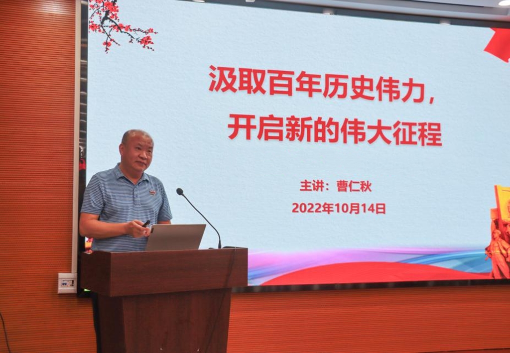 曹仁秋副书记为培训班学员做了《汲取百年历史伟力,开启新的伟大征程》为主题的专题党课。曹仁秋副书记从明确的“两个确立”重大意义、党的百年奋斗历史成就和历史经验、马克思主义中国化新的飞跃、习近平新时代中国特色社会主义思想的核心内容、新时代的中国共产党等五个方面深入浅出地进行了讲解,并与培训班成员分享了学习党的重要理论的心得体会,亲切寄语学员能够高度重视并深入开展理论学习,不断提升政治素质和业务水平。