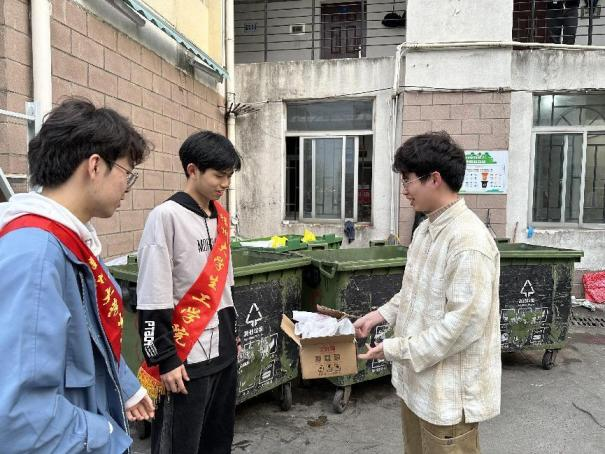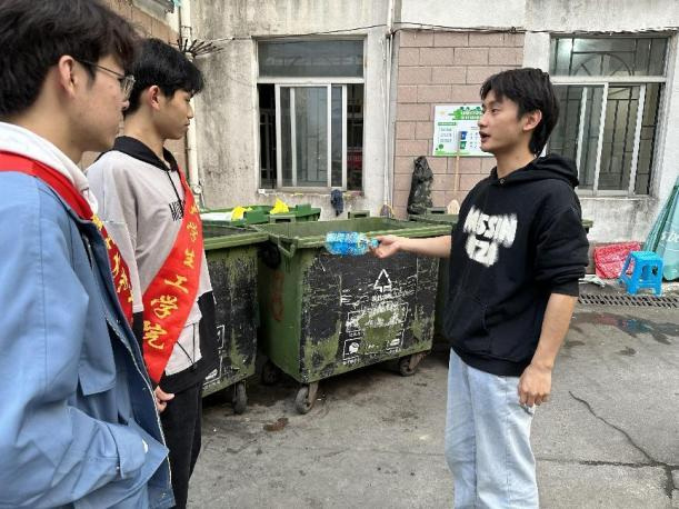 在生活区8号楼开展了卫生督导活动,帮助并监督同学做好垃圾分类。活动现场,志愿者们在垃圾投放点位上进行督导,当有同学带着垃圾来进行投放时,志愿者们便会上前帮助同学们进行分类,并讲解垃圾分类的重要意义,倡导同学们在日常生活中要养成垃圾分类的良好习惯。