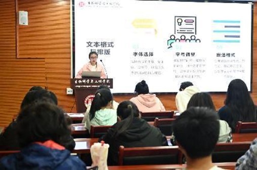 院团委学生会宣传部门负责人详细讲述了文稿撰写、PPT制作和简单摄影的注意要点。新闻部部长李彤讲解了新闻撰写、发表的主要流程,并通过实例着重讲解了新闻稿件和微信推文稿件的规范格式;视觉艺术部正职负责人刘玫含为同学们讲述了制作PPT的技巧和要点;在摄影技巧方面,视觉艺术部副职负责人谢伊泽结合自身经验向大家分享了有关拍摄方面的专业知识。