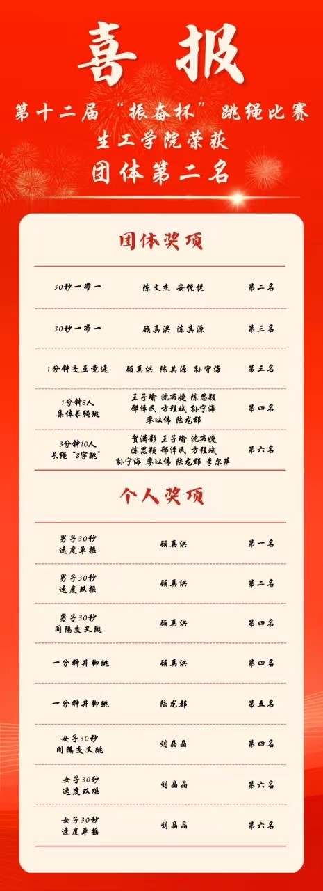 在2024年5月26日成功举办爱爱视频 第十二届“振奋杯”跳绳比赛中,爱爱视频 学子奋勇争先,不仅在多个团体项目中勠力同心,荣获团体第二名的好成绩;也在个人项目中奋勇争先,展现青春风采。他们出色的表现不仅激励着更多的同学们将体育锻炼融入日常生活,让体育成为生命的一部分;更表现了生工学子团结一致、勇于拼搏和自信昂扬的精神风貌!