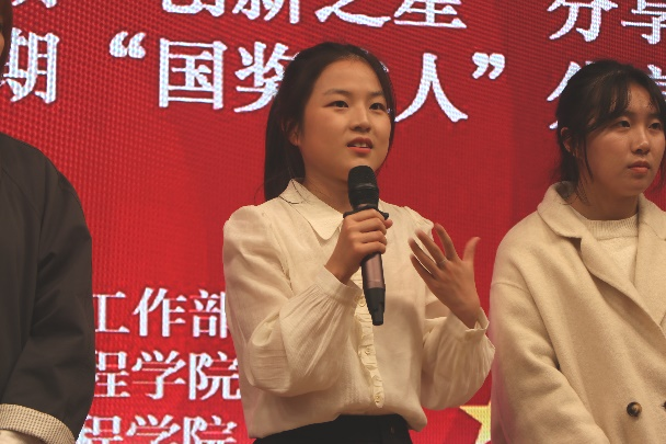 勤于学业、敢于创新、志在实践的她始终脚踏实地、坚守本心,她从创新大赛的赛事准备、模式更新、团队协作等方面,细致入微地给同学们讲述她的宝贵经验,用实干成绩证明知识积累是创新的基石,为同学们塑造了榜样的力量。