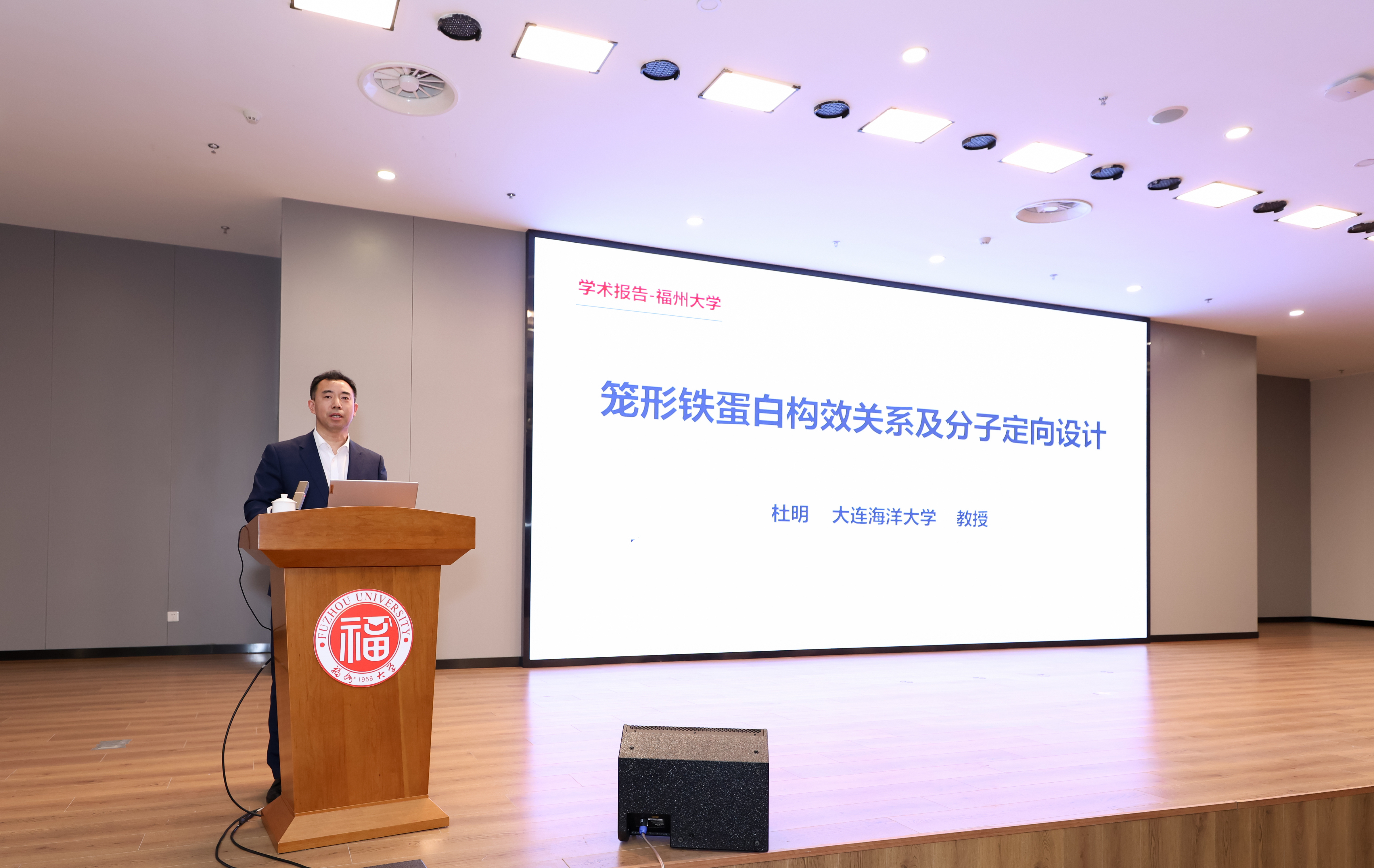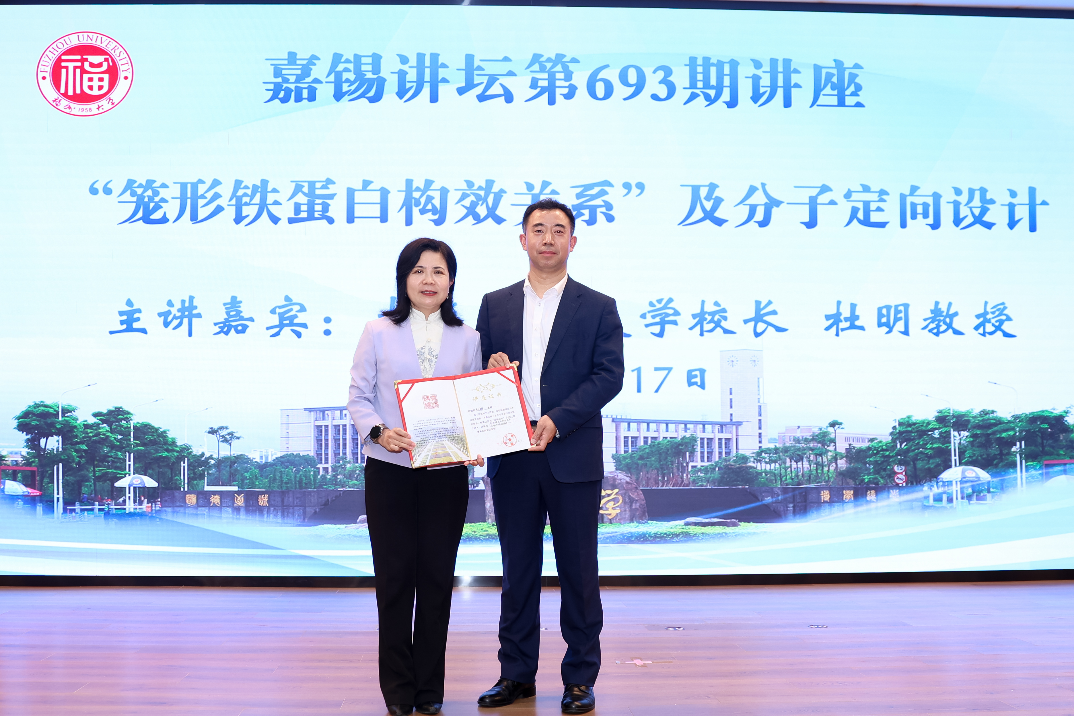 主办的嘉锡讲坛第693期讲座在晋江楼一楼报告厅举行。大连海洋大学校长、博士生导师杜明教授应邀作题为《笼形铁蛋白构效关系及分子定向设计》的专题报告。校党委常委、副校长杨黄浩教授热情会见杜明校长,学院院长汪少芸教授主持讲座,全校200余名师生共同聆听了学术报告。