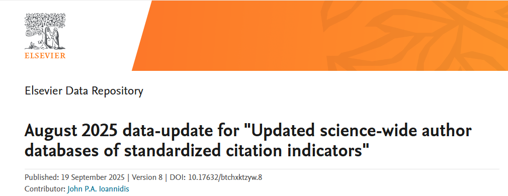 2025年9月19日,斯坦福大学(Stanford University)和国际权威学术出版社爱思唯尔(Elsevier)共同发布2025年全球前2%顶尖科学家榜单(World's Top 2% Scientists)。