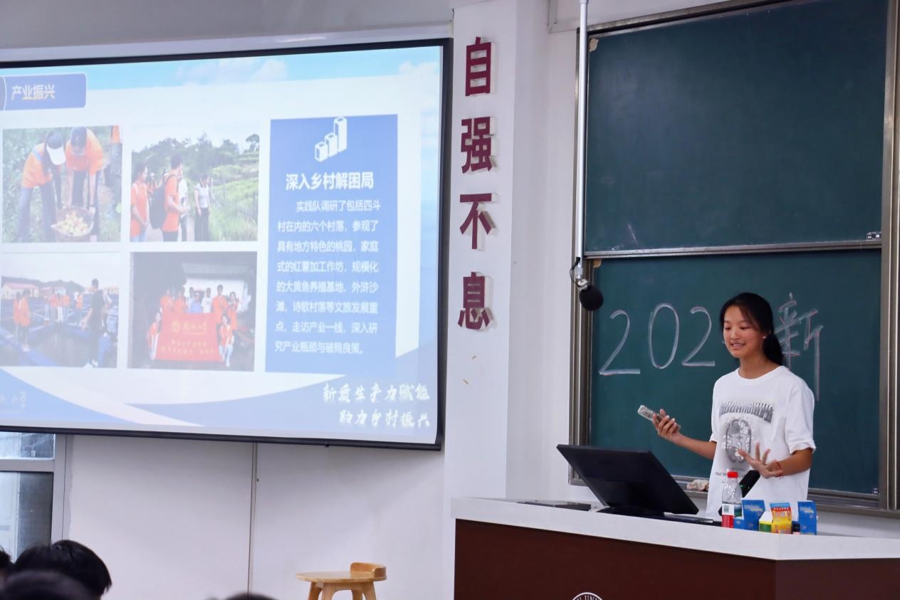 汇报尾声,彭嘉璇分享了自己的成长感悟。她表示,本次社会实践活动让她收获颇丰,不仅对乡村振兴有了更全面、深刻的认识,更极大地锻炼了自己的团队协作能力。在面对复杂的调研任务时,队员们分工合作、相互支持、共同探讨,攻克了一个又一个难关。她真切地希望每一位同学都能有机会参加一次令人难忘的社会实践,在实践中增长见识、提升能力,为社会发展贡献自己的青春力量。