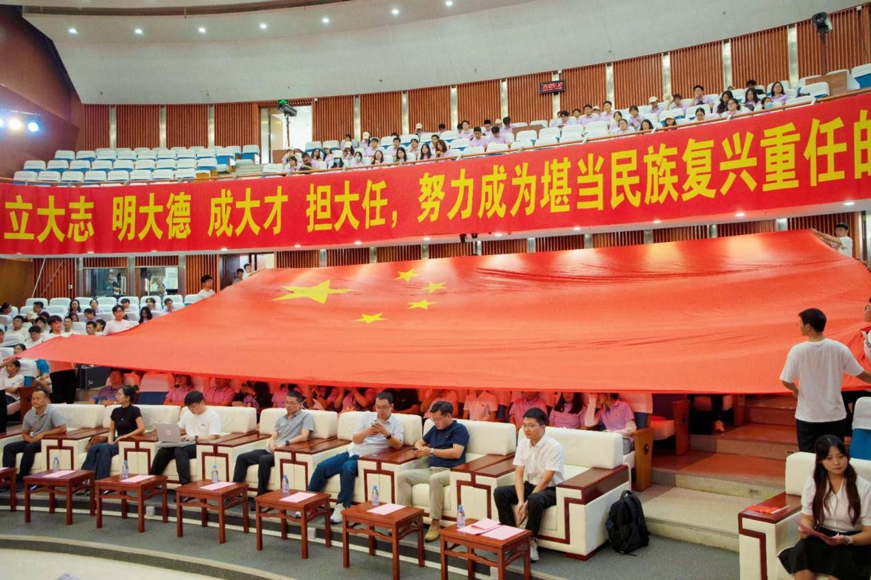开学典礼暖场环节,舞动的巨幅国旗如同生生不息的火焰展开,瞬间点燃全场氛围。全体新生齐声高呼“生而闪耀,工无不克,心怀祖国,青春担当”的口号,声浪铿锵响彻会场,开学典礼的帷幕就此拉开。