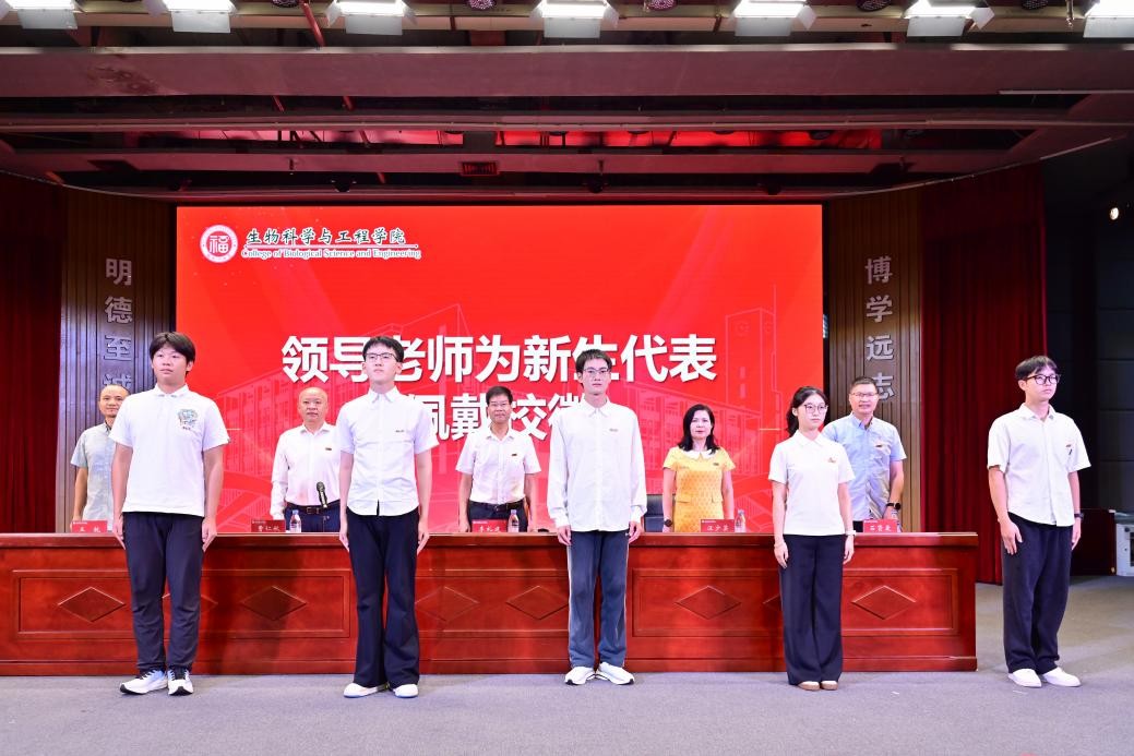 开学典礼在庄严雄壮的国歌声中正式开始。首先举行的是新生佩戴校徽仪式,学院领导与会老师亲自为2025级本科及研究生新生代表佩戴校徽并合影留念。这枚校徽不仅是“福大人”身份的象征,更寓意着全体2025级新生正式融入生工大家庭,肩负起生工学子的责任与使命。