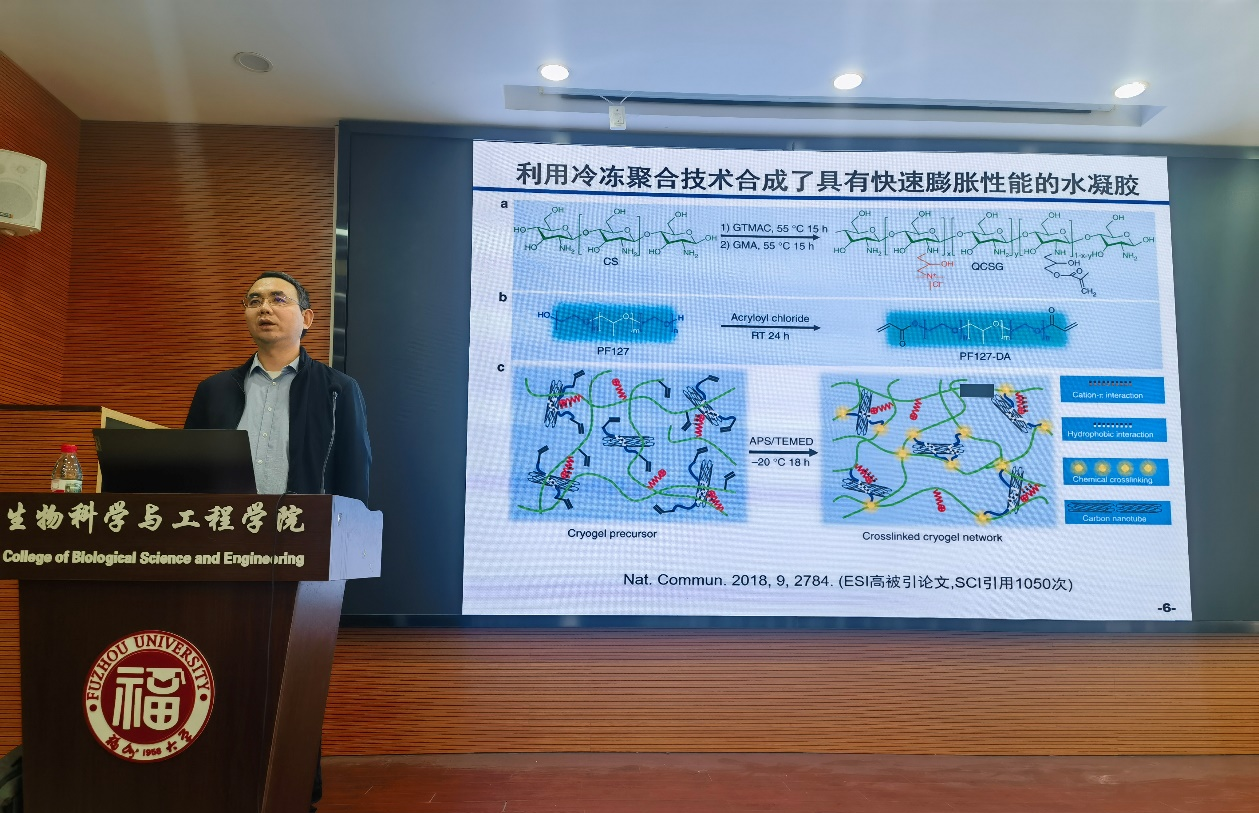 “生工讲坛”,在生工北楼二楼柏物产厅作了题为《快速止血和促组织修复多功能水凝胶》的学术报告,吸引了众多师生到场聆听与交流。