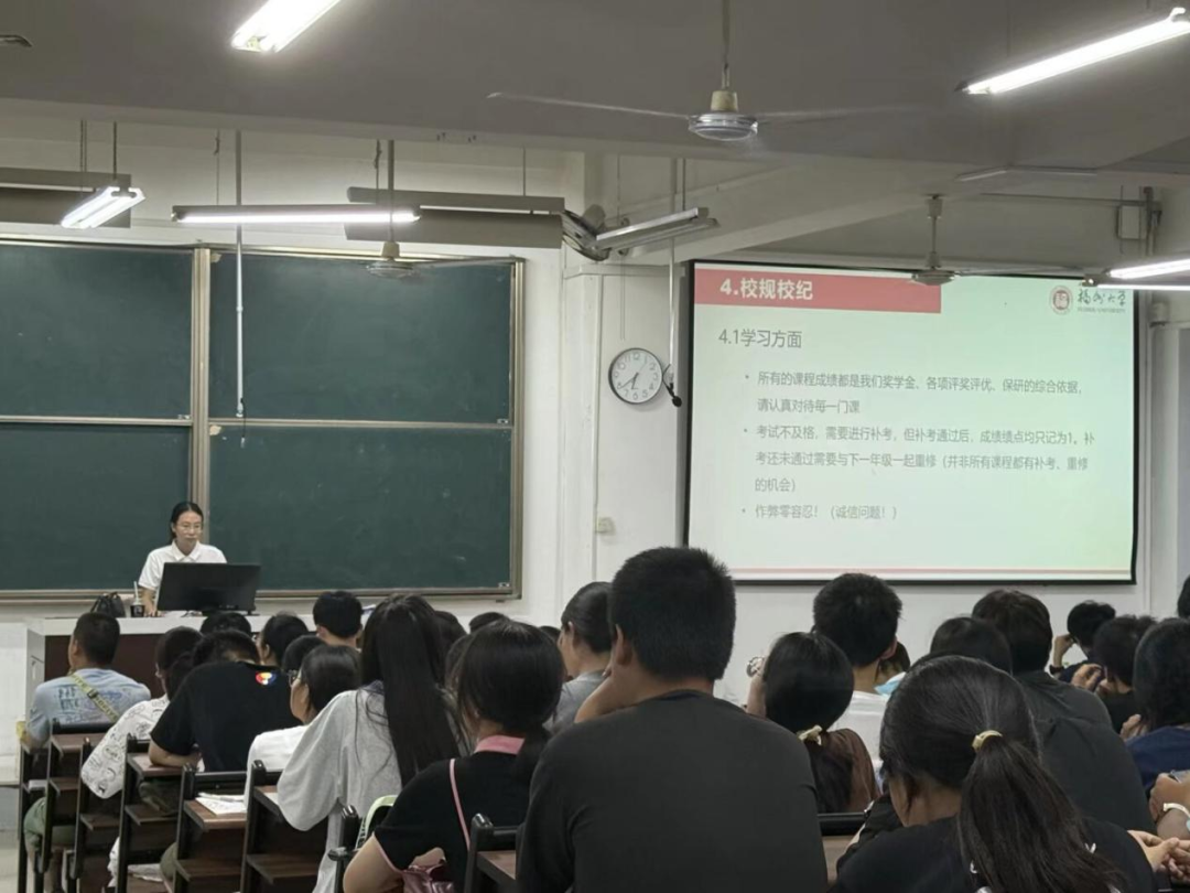 组织2025级本科生在铜盘校区教学楼B111教室开展了以“百学须先立志,行稳方能致远”为主题的校纪校规教育讲座。讲座由2025级本科生辅导员杜美佳老师主讲。
