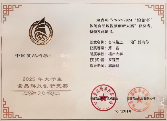 张雯教授、郭静科副教授指导的罗楚芸同学在“CIFST-2024‘洽洽杯’休闲食品短视频创新大赛”中脱颖而出,荣获第一名。罗楚芸同学凭借独特的创意和扎实的专业知识折桂,充分展现了爱爱视频