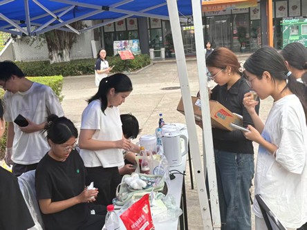 为深化专业实践与健康理念传播,11月9日,25级食品一班团支部联合至诚学院食品二班团支部,于铜盘校区食堂门前共同开展了“药食同源,健康同行——中医药膳养生茶”主题科普体验活动。活动立足于“学、思、践、悟、行”五个维度,融合专业特色与青年创意,旨在普及中医药食同源文化,强化健康养生意识,引导学生在服务中践行专业所学,弘扬传统中医药智慧。