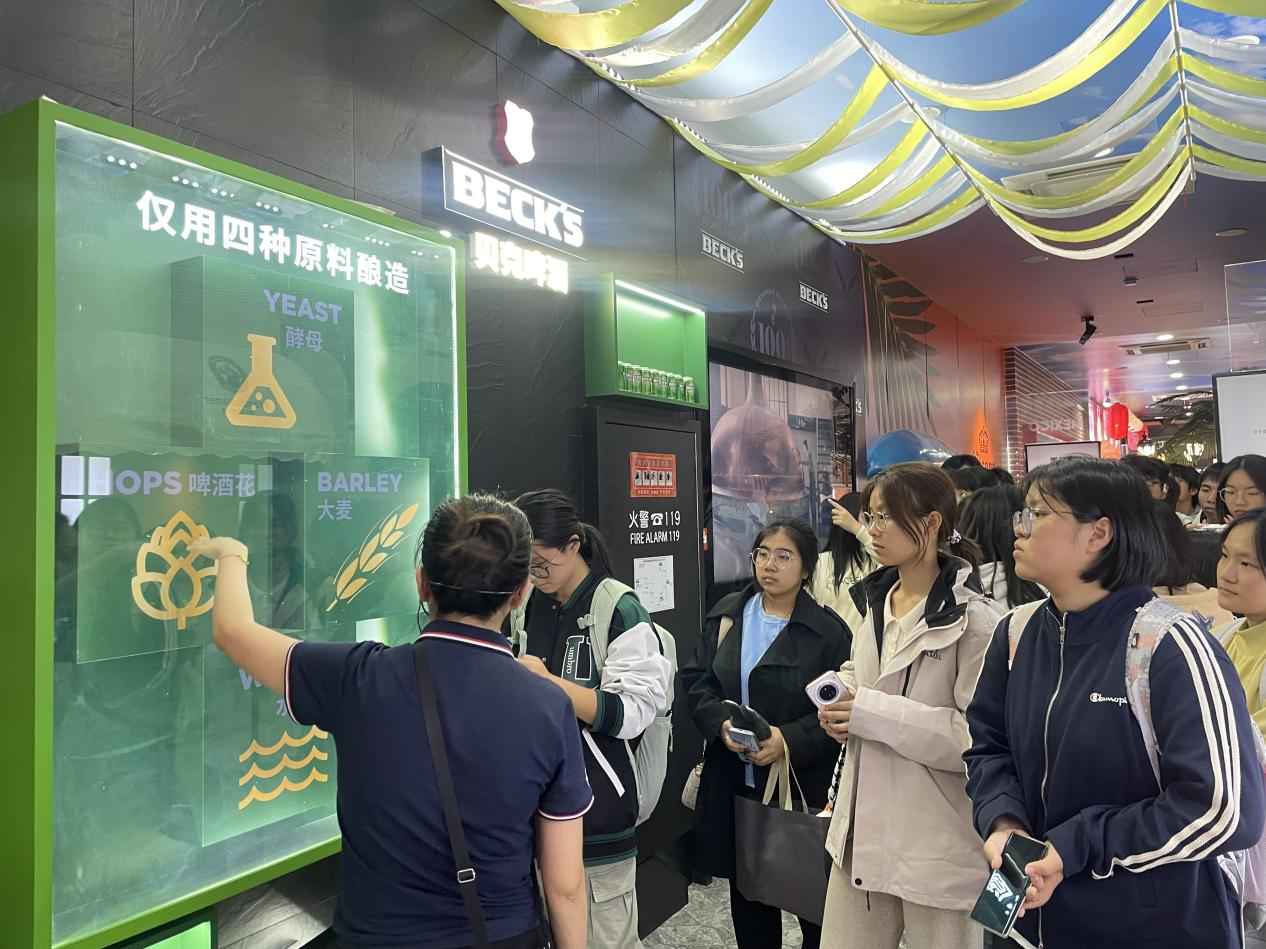 研学首站,师生们抵达了百威中国啤酒博物馆。步入充满现代气息的体验区,同学们在讲解员的引领下,沿着啤酒发展的历史长廊,探寻从古老酿造起源到全球品牌发展的轨迹,感受百年企业积淀的深厚文化。场馆内弥漫的麦芽香气,瞬间拉近了同学们与酿造科学的距离。