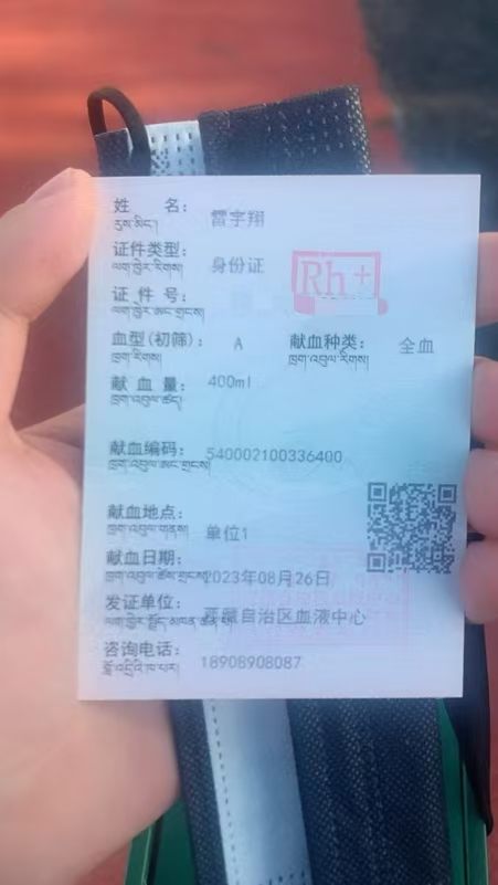 “献血早已融入我的生活,成为一种本能的牵挂。”雷宇翔的热血之旅始于18岁的专科时光,此后无论是校园求学还是军营历练,这份对生命的热忱从未中断。在他的献血档案中,有一张特殊的献血证格外珍贵——2023年8月26日,他在西藏自治区血液中心捐献了400cc全血。在高原缺氧的环境下,他依然毫不犹豫地挽起袖子,将温热的血液留在了雪域高原,用实际行动践行着对生命的敬畏。