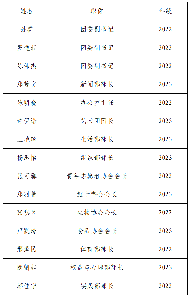 2024届学生团委副书记、各部门部长,现将名单公示如下: